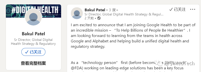 | 像所有大型科技公司一样,谷歌在过去几年进军健康和医疗保健领域。但结果好坏参半。它的雄心壮志从算法挖掘健康数据,到开发疾病检测工具,再到可穿戴设备,并经历了一些动荡,比如2021年8月解散了谷歌健康部门。但谷歌体系很大,今天盘点的是谷歌云、Verily、Google Ventures。2022年5月18日,据美国媒体报道,前 FDA 全球战略与创新首席数字健康官Bakul Patel入职谷歌,任谷歌健康全球数字健康战略和监管高级总监。 实际上这是他自己在领英上说的。(并非谷歌官方披露) Patel讲述了他在 FDA 的“自 2008 年以来令人难以置信的旅程”的亮点,包括: