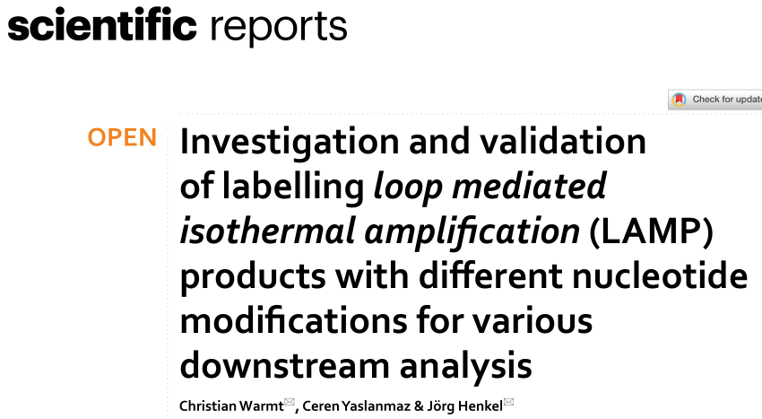 环介导等温扩增(LAMP)是最著名和最流行的等温扩增方法之一。它的简单性和速度使该方法特别适合于护理点诊断。然而,假阳性结果仍然是一个主要缺点。许多(下游)应用用于检测LAMP扩增子,如比色分析、原位LAMP或CRISPR Cas系统。通常,对于不同的检测应用,如横向流动分析,需要对LAMP产品进行修改。这通常是通过事先修饰引物实现的。 近日,来自德国的研究团队在Scientific reports上发表了一篇题为“Investigation and validation of labelling loop mediated isothermal amplification (LAMP) products with different nucleotide modifications for various downstream analysis”的文章,研究的目的是评估不同修饰核苷酸(如Cy5-dUTP、生物素-dUTP和aminoallyl-dUTP)的扩增子标记作为预标记引物的替代方案。研究团队研究了分子大小、核苷酸量以及靶浓度对扩增和标记效率的影响。这项研究表明,在LAMP过程中,使用不同的修饰核苷酸可以实现LAMP扩增子的不同标记,并且这些样品可以通过荧光光谱、凝胶电泳、微阵列和横向流动系统等广泛的下游应用进行分析。此外,研究团队还证明了基于微阵列的检测以及识别和区分假阳性的能力。 图片来源:Scientific reports LAMP背景及优劣势 2000年,Notomi等人开发了一种新的等温扩增技术,名为环介导等温扩增(LAMP)。二十多年后,LAMP属于最流行的等温放大技术。该方法基于一组多达6个引物和一个链置换聚合酶,能够高度敏感和特异地扩增少量目标DNA。结合逆转录酶,它也适用于RNA扩增(RT-LAMP)。到目前为止,在RT-LAMP、RIME-LAMP或DARQ-LAMP等多个变体版本中,可以找到超过千份使用该技术的出版物。自2019冠状病毒疾病大流行开始以来,已经发表了800多篇关于SARS-CoV-2检测的出版物。其中,大约有100个是用LAMP作为检测方法的。这不仅强调了LAMP对一般研究的重要性,也强调了它对当前全球重要问题的重要性。 与基于PCR的非等温方法相比,使用LAMP进行核酸扩增和检测具有许多优势。首先是放大速度。通过使用合适的引物组和最佳扩增条件,可以在不到30分钟的时间内检测到少量目标核酸,而PCR过程的扩增时间最多为3小时。此外,由于对能源和技术设备的需求减少,护理点设备中集成和使用LAMP是非常方便的。尽管LAMP有许多优点,但由于污染、序列相似性和引物二聚体引起的扩增假阳性是众所周知的LAMP缺点。 LAMP扩增产物的检测方法 LAMP与下游分析系统结合检测扩增产物的方法很广泛。包括标准凝胶电泳和定量扩增LAMP(qLAMP),通过不同的比色试剂(酚红、无色结晶紫、SYBR绿、孔雀石绿)进行横向流动分析(LFA)或与CRISPR-Cas系统的组合。最常用的是LFA和比色分析,但上述技术的主要局限性在于,它们不适合区分假阳性结果。基于微阵列的检测方法有助于克服这一障碍。 长度约为20–30 nt的特异性单链DNA探针固定在修饰表面上。扩增后,产物可以在这些探针上进行高度特异性杂交。通过选择合适的探针,不仅可以将扩增子与假阳性区分开来,甚至可以将其与单核苷酸多态性(SNPs)区分开来。 使用(半)定量分析系统(如qLAMP)和基于横向流动的方法需要标记用于目标检测的扩增子。到目前为止,使用预先标记的引物或探针一直是首选方法。这也导至了低灵活性和高成本、信号强度或放大效率调整不灵活性。或者,可以在扩增过程中使用预先标记的核苷酸进行靶向标记。这些类型的核苷酸具有不同的修饰,例如荧光团、生物素或氨基功能化,用于随后的定制标记。 灵活的LAMP标记方法 本研究旨在分析和评估所述基于直接和灵活的LAMP标记方法。此外,还证明了用3-Cy5-dUTP、生物素-dUTP和AA-dUTP标记LAMP扩增子的优缺点,代表了小、中、大尺寸的核苷酸修饰。 上述核苷酸修饰不仅具有不同的分子大小,而且在不同的分析和检测系统中也有用。Cy5-dUTP可用于用荧光团直接标记扩增子,用于多种荧光检测方法,结合生物素dUTP可在常用LFA中的链霉亲和素修饰表面上实现非共价固定。AA dUTP被认为允许加入一个功能基团,这可能有助于后续NHS分子的标记。 LAMP-dUTP标签策略及应用。 图片来源:Scientific reports x-dUTP掺入对LAMP效率的影响 为了确定在LAMP期间使用标记核苷酸对扩增效率的影响,使用不同量的SARS-CoV-2 cDNA和Cy5-dUTP以及生物素-dUTP和AA-dUTP稀释系列进行了基于SYBR绿色的定量环介导等温扩增(qLAMP)。每个反应的cDNA量为4.2E+00ng,Cy5-dUTP浓度范围为4.0E-03mM到2.0E-01mM,在不到5分钟的时间内检测到目标DNA。使用该量的靶DNA的反应效率只有轻微差异。然而,当使用较低数量的靶DNA时,已观察到扩增效率降低。 标记核苷酸对扩增效率的影响。 图片来源:Scientific reports 与未标记的核苷酸相比,Cy5-dUTP是一个相对较大的分子,因此研究团队研究了使用不同分子大小的各种dUTP标签对扩增效率的影响。对于AA-dUTP(589.2 g/mol)、生物素-dUTP(862.7 g/mol)和Cy5-dUTP(1387.3 g/mol),在以分子量表示的分子大小和所需的扩增时间之间发现了明显的相关性。未标记的参考样品的Ct值为15.6分钟。使用生物素dUTP和AA dUTP标记也会导至Ct值小于16.5分钟。使用Cy5 dUTP对扩增时间的影响最大,Ct值偏移为3.5分钟。 分子大小和浓度的影响。图片来源:Scientific reports Cy5-dUTP掺入和分析 通过Cy5-dUTP直接标记和AA-dUTP间接标记以及随后的NHS-Cy5标记,计算Cy5掺入LAMP扩增子的速率。LAMP扩增产物通过荧光光谱分析,记录在630nm激发下600 nm至800 nm范围内的发射光谱(图4A)。所有样品(Cy5稀释系