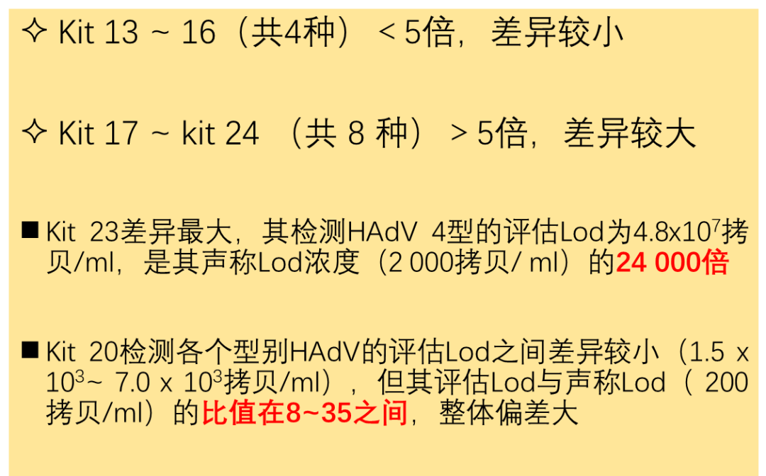 摘要 小编在学习最低检测限相关的文献时,偶遇一篇中检院专注最低检出限这一性能指标,同步评比28个国产呼吸道病原体检测试剂盒的文章,汇集了当前分子诊断领域的多家公司,诸如之江、圣湘、达安、透景、硕世等等,内容相当精彩特推荐给大家,希望能带来启发。 引言 今年1月18日,施瓦布社会创业基金会在2022世界经济论坛的达沃斯宣布,全球共15人上榜年度社会创新者名单,其中唯一的中国获奖者是杭州老爸评测创始人魏文锋。这个最初只是为了检测女儿的包书皮是不是合格的魏老爸,已经在评测的道路上越走越成熟。 说起评测,大家更熟悉的可能是那个曾经跟锤子罗永浩狼狈对峙,后来甩手转嫁董明珠的手机评测大拿王自如。那么我们IVD行业,有没有这类评测的可能性呢?小编跟朋友喝茶谈天的时候,也曾构思能不能联合检验机构搞个IVD试剂大测评,比如HPV、新冠这种高消耗的试剂,都拉出来溜溜,再各家收点保护费…… 吹完也就回家洗洗睡了,但当小编看到《基于不同型别腺病毒标准品的呼吸道病原体核酸试剂最低检测限性能评价》这篇文献时,才发现中检院已经开始行动了。先来看看网罗的公司阵列—— 涉及公司汇总 大咖就是大咖,一出手就网罗了24家分子诊断相关的公司。别看拿证的只有几家,呼吸道病原体的玩家还真是蛮多的,耳熟能详的分子诊断公司基本都在了。 涉及产品汇总 下表列出了本次评测涵盖的28种试剂盒 其中注册情况、单病原or多重、浓度单位和方法学情况统计如下: 方法学层面,最常规的还是荧光PCR方法,但同时也朝着POCT和自动化的方向在探索和发展。 关于呼吸道病原体的背景资料 呼吸道病原体感染引发的疾病是人类最常见感染性疾病之一,近年来已发生包括: 2003年非典型性肺炎(severe acute respiratory syndrome, SARS ) 2009年甲型H1N1流感 2013年H7N9禽流感 2015年中东呼吸综合征(MERS) 目前仍在全世界流行的新型冠状病毒肺炎(COVID-19)等 多个呼吸道病原体引发的疫情快速和早期检出病原体感染是控制感染传播和及早进行抗病毒治疗或干预的关键。 呼吸道病原体核酸检测作为目前主要的诊断方法,其敏感性高、特异性强,能够早期诊断,在防止疫情暴发流行、延缓传播速度及指导临床治疗等方面起到了重要作用。受新冠疫情影响,近几年国内外研发及上市了大量新冠及呼吸道病原体核酸检测试剂。 人腺病毒(human adenovirus, HAdV )目前已发现7个亚群(A-G),超过50种血清型和90种基因型。致病性腺病毒可感染呼吸系统、消化系统、泌尿系统和眼部等,引起相应的临床症状,其中以呼吸道腺病毒更为常见。可导至呼吸道感染的腺病毒主要集中在B亚群,包括3、7、11、14、16、21、34、35、50和55等,另外C亚群的1、2、5、6、57型等也常引起呼吸道感染HAdV型别多样,但目前的多数呼吸道病原体核酸检测试剂在研发时未使用多种型别进行最低检测限(limit of detection, Lod)性能的评估。2019年,国家药品监督管理局(NMPA)起草并发布了《呼吸道病毒多重核酸检测试剂技术审查指导原则》,用于对本类试剂研发和注册申报进行指导,其中明确要求应至少使用HAdV l、2、3、4、 5、7、55型等七种型别对试剂盒的Lod等性能进行评估。目前国内外并无针对企业研发试剂时Lod性能评估准确性的相关研究,本研究使用已研制的呼吸道腺病毒核酸标准品对国内28种呼吸道病原体核酸检测试剂的Lod进行了评估和比较。 标准品信息 病毒培养物冻干: 人呼吸道腺病毒1、2、3、4、5、7、55型核酸标准品由本实验室提供,均为腺病毒培养物经热灭活后冻干制备而成。 定值: 标准品采用多数字PCR平台、多实验室进行联合定值。腺病毒1、2、3、4、5、7、55型核酸标准品浓度如下: 试剂盒Lod评估 参照美国临床实验室标准化协会(Clinical and Laboratory Standards Institute, CLSI)的EP17-A2文件,采用Probit回归方法对28 种不同方法学原理的呼吸道病原体核酸检测试剂的最低检测限进行评估根据待评估试剂盒lod水平,对已知浓度的1、2、3、4、5、7、55型HAdV核酸标准品进行3倍倍比稀释,在试剂盒Lod浓度上下各进行21次重复检测,具体检测过程按照试剂盒说明书要求进行:使用SPSS16. 0软件对各试剂盒检测不同型别标准品的结果进行Probit回归分析,将 95%置信水平浓度作为其评估Lod( measured Lod); Lod比较分析:如果试剂对各型别HAdV的评估Lod浓度均不高于2倍声称Lod浓度(2 X claimed Lod)为一致性较好;如试剂评估Lod浓度大 于2倍声称Lod浓度,则视为一致性较差。 整体结果如下: 前12个试剂盒(中检院是匿名测试,与上面的试剂盒顺序无关)1、2、3、4、5、7、55型HAdV核酸标准品的评估Lod浓度均小于2倍声称Lod浓度,其声称Lod与评估Lod一致性较好,代表这些试剂盒Lod性能评估具有较好的准确性。 试剂盒Kit 13-24(共12种)声称Lod与评估Lod的一致性较差,其中 浓度最低的是Kit 1,为20拷贝/ml ( HAdV 1型) 浓度最高的是Kit 23,为4. 8xl0^7拷贝/ml(HAdV 4型) 其差别可高达10^6数量级。 一致性较差的原因分析 一致性差异较大的8种试剂盒(Kii 17—kit 24)中,除3种方法学为荧光PCR 法外,其余均为数字PCR法、核酸质谱法、PCR毛细电泳片段分析法及微流控芯片-PCR荧光探针法等, 使用新方法学的研发企业往往成立时间较短,其研发经验缺乏及使用方法学的欠缺成熟稳定是导至一致性较差的可能原因。 友情提醒 部分试剂对不同型別腺病毒的检测LoD也不相同,其最低和最