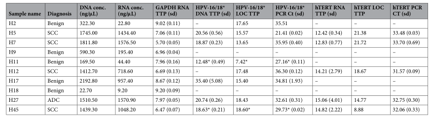 使用LOC对45份来自当地组织采集的可用样本中的10份进行了HPV DNA和hTERT mRNA验证,其中DNA和RNA的数量和质量表明由于细胞数量多,提取效果良好。根据病理学分类,在这10个宫颈活检标本中,有5个良性,4个鳞状细胞癌(SCC)和1个腺癌(ADC)。