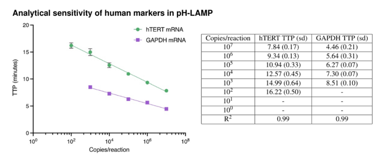 pH-LAMP中人类标记物的分析灵敏度。