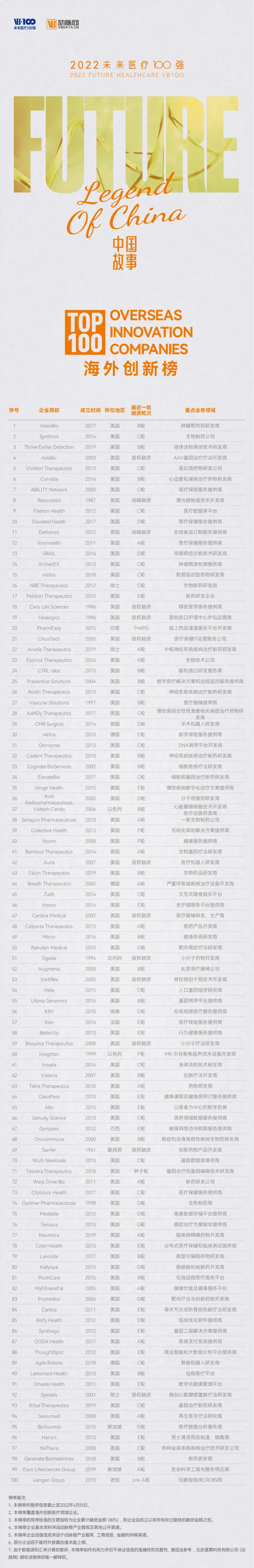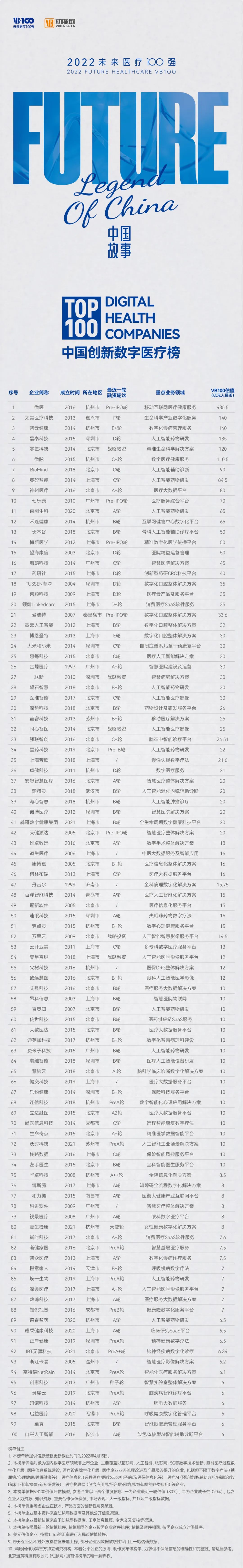 创立于2015年的未来医疗100强榜是由VB100、动脉网、蛋壳研究院推出的国内第一个针对非上市企业的创新医疗领域榜单,旨在遴选真正代表未来医疗的中国创新医疗者,发现我国未来医疗产业的核心力量,推动健康医疗产业的创新变革进程。七年来,未来医疗100强榜单体系不断丰富,逐步构建形成面向企业、投资机构、医院、产业园区的全球性创新医疗健康生态榜单,是目前生命健康领域最受产业界、资本界关注的年度评选。
