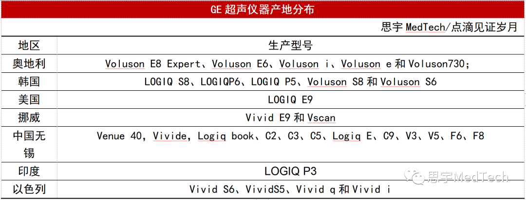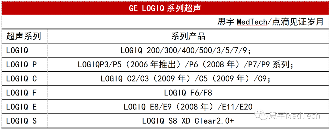 影像系列已盘点迈瑞医疗超声,今天思宇MedTech盘点GE超声产品线。 01 GE超声主要有五条产品线,LOGIQ系列,VIVID系列,Voluson系列,VENUE系列,ABUS系列。 (一)LOGIQ系列 LOGIQ系列来源于GE收购的美国超声公司Diasonics,并结合自己产品而开发出的。 LOGIQ系列主要应用于全身,产品涵盖高中低端市场。 GE容积导航超声产品,实操性主要面向二甲及二甲以上医院,定位高端,主要竞争产品是飞利浦IU22、西门子ACUSON S2000、日立图腾、东芝Aplio300和百盛MyLab Twice等。 LOGIQ S8:定位中高端,主要面向二级医院,功能方面低于E9; LOGIQ S7:与S8几乎相同,只是具有较少的功能和探头选项,价格比S8低; LOGIQ P6:定位中高端,主要面向二级医院;分为pro和Premium版本; LOGIQ P5:定位中端,主要面向二级医院;分为pro和Premium版本; LOGIQ P3:LOGIQ产品线中经济型产品。 LOGIQ P5、LOGIQ P3、LOGIQ C5 Premium、LOGIQ e和LOGIQ Book X定位中低端,主要面向二级及二级以下医院。 现推出的华声,华韵,华章系列基础超声主要用于和国内中低端超声竞争。 LOGIQ E 用于临床上用,分为LOGIQ eEmergency Edition,麻醉版; (二)Voluson系列 Voluson系列彩超主要应用于妇产科。 产品涵盖高中端市场,主要型号包括: VolusonE10(2014),VolusonP8,Voluson E8 Expert、Voluson E6、Voluson S10,Voluson S8、Voluson S6、Voluson i(便携)、Voluson e(便携)、Voluson 730。 Voluson S10:可搭配单晶探头。 Voluson E8 Expert:GE高档妇产彩超,主要面向二甲及二甲以上医院,定位高端,主要竞争产品是飞利浦IU22,西门子ACUSON S2000等; Voluson E6:GE高端妇科彩超,主要面向二甲级别医院,定位中高端,和E8基本相同,只是具有较少的功能和预设功能选项,价格比E8低。 Voluson S8:GE中高端妇产彩超,主要面向二级医院; Voluson S6:和S8类似,只是具有较少的功能和探头选项,价格比S8低 Voluson i(便携)、Voluson e(便携)和Voluson730,定位中低端,主要面向二级医院。 Voluson i:采用4D技术的便携超声; (三)VIVID系列主打心脏方面的应用 常见的产品有:VIVID3、4、System Five、7、S5、S6、Vivid E9、E80、E90、E95、T8,T9、Vivid i、Vivid q,S70N,S60N。 Vivid E9:VIVID E9配有心脏4D成像探头,GE旗舰心血管超声产品,主要面向二甲及二甲以上医院,定位高端,主要竞争产品是飞利浦IE33(EPIQ7 C),其次是西门子ACUSONSC2000; Vivid S6:Vivid S6是一款具有心脏专科特色的全身应用型彩超,主要面向二甲级别医院,定位中高端,竞争产品包括飞利浦HD15等。Vivid S5和S6几乎相同,但是相比S6功能少,价格低。 Vivid I :心脏应用中最流行的便携超声; Vivid q:Vivid i的高级版本,增加了量化功能,高端便携心脏彩超,定位高端,主要面向二甲及二甲以上医院,主要竞争产品是飞利浦CX50; Vivid i、Vivid S5和Vivide定位中端,主要面向二甲及二甲以下医院。 GE的手持式超声Vscan(手机大小)可以扫查心脏功能,主要用于临床急诊检查以及户外急救。 Venue 40:主要面向临床麻醉; 02 GE医疗超声产品共有7个产地:奥地利、韩国、无锡、美国、挪威、以色列和印度,不同国家负责生产不同机型。 03 1994年,GE超声产品开始进入中国市场。 1996年,GE与海鹰合资在成立海鹰无锡工厂,此举也间接催生另外一家中国超声公司无锡祥生CHISON和飞依诺(飞依诺老板是GE超声研发中心经理) 现在该工厂也已经转变为GE独资企业,无锡公司也已经成为GE全球最大的超声生产基地和探头生产基地,无锡工厂生产的超声产品占GE全球超声销售量高达40%。 1998年,GE以2.3亿美金从以色列公司ELBIT手中收购DIASONICS VINGMED威曼公司,布局心脏超声市场。 2000年,GE收购超声探头厂家PDI(ParallelDesign Inc)。VOLUSON系列的4D探头主要由PDI提供。PDI也提供高端4D探头的OEM服务。 2001年,GE以8300万美金从韩国麦迪逊MEDISON手中收购奥地利KRETZ的65%股份,开始布局妇产科四维超声,此次收购奠定了GE在妇产科超声市场的领导地位。 (备注:1989年,奥地利公司KRETZ推出世界上第一款3D超声COMBISON330。1996年韩国麦迪逊收购奥地利KRETZ。1998年麦迪逊/KRETZ推出世界上第一款4D超声VOLUSON730,其中版本为BT01,BT02。2000年KRETZ销售额1.1亿美金。2001年激进扩张的麦迪逊破产,被韩国银行接管,其持有的KRETZ公司股份被卖给GE,以清偿债务) 2002年,Vivid系列超声产品上市。 2003年,GE收购法国THALES探头业务,推出VOLUSON730Expert 和PRO两个型号的妇产科超声诊断仪,从此GE发扬光大了VOLUSON系列,最终V730全球卖出了两万台,成为一代神器。麦迪逊的V730版本为:BT01,BT02,GE的V730版本为:BT03、BT04、BT05、BT08)。 2006年,推出LOGIQ P5和LOGIQ S6。 2007年,GE 拟以81.3亿美元收购雅培诊断业务最后阶段谈判破裂。 2007年,推出突破性的产品VOLUSON E8。 2008年,增加LOGIQ P6和LOGIQ E9。 2009年,金融危机时针对中国4万亿的投资和乡村医疗计划,开发出了LOGIQ C3、LOGIQ C5 图像质量经济型的投标产品。 2012年,GE收购美国U-SYSTEMS乳腺超声公司(全乳容积超声ABUS的领导者),布局妇女建康乳腺筛查市场。为提高女性乳腺疾病早筛意识,更好地实现疾病的早发现、早诊断、早治疗。以ABUS作为筛查手段,定位基层社区进行义诊与患教系列活动("粉红义诊”"两癌筛查")。 2013年,GE 2亿美元收购韩国X线制造商Vatech Co下属的Rayence的部分乳腺X线摄影术资产。 2014年,GE 10.6亿美元收购赛默飞三大业务,包括细胞培养、基因调节和磁珠业务。 2016年,携手华为加速打造工业互联网生态圈,积极推动工业互联网在医疗行业的落地。 2016年,GE从微软收购了Caradigm的全部股份。Caradigm目前在全世界有