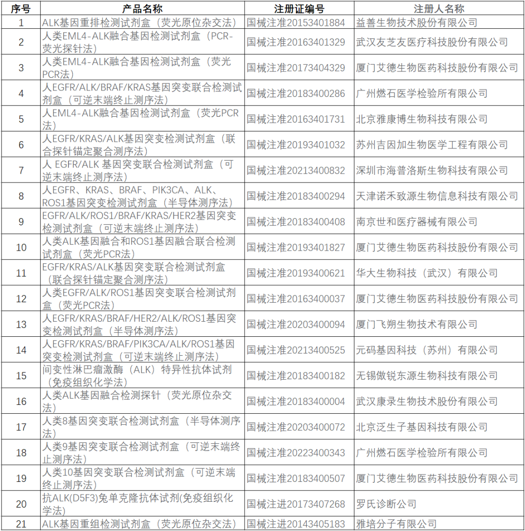 ALK ALK 基因重排(融合)是 NSCLC 中发现的第二个明确可靶向用药的驱动基因变异,发生率约为 3~7%,常见于年轻、不吸烟的肺腺癌患者。国内检测该基因的获证产品见表5。 表 5 涉及ALK基因的产品列表