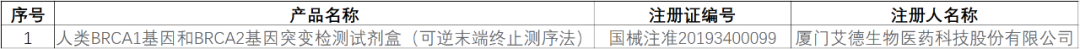BRCA1和BRCA2 BRCA1基因和BRCA2基因全编码区(包括BRC41基因(NM007294.3)外显子2、3、5~24,BRCA2基因(NM000059.3)外显子2~27)及外显子-内含子连接区、UTR区(非翻译区)和启动子区的点突变和插入缺失突变,可用于奥拉帕利片的相关用药指导。目前国内检测该基因的获证产品仅有厦门艾德一家,见表13。思路迪公司的人类 BRCA1 基因和 BRCA2 基因突变检测试剂盒(可逆末端终止测序法)配套软件已经获批(详细数据见优咨康公众号4.7号:【测序篇】已上市IVD产品分析报告),预计该试剂盒不久后也会面市。 表 13 涉及BRCA1基因和BRCA2基因的产品列表