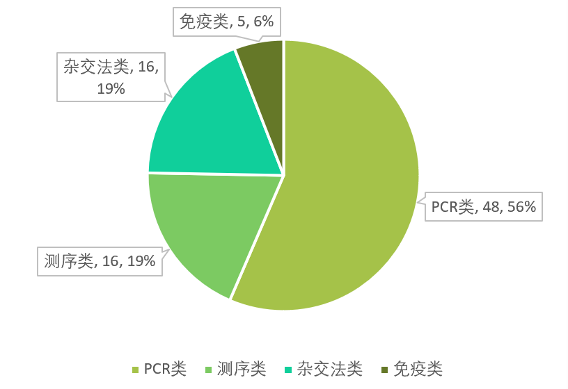 涉及了四类方法/技术:PCR类、测序类、免疫类和杂交类,具体数据见图2。 PCR类含:PCR荧光法、TaqMan熔解曲线荧光PCR法、PCR-荧光探针法、荧光PCR-毛细管电泳法、Taqman-ARMS法、多重荧光PCR法和数字PCR法(数字PCR入场)。 测序类含:Sanger测序法、焦磷酸测序法、半导体测序法、可逆末端终止测序法和联合探针锚定聚合测序法; 杂交类含:荧光原位杂交法、流式荧光杂交法和原位杂交法; 免疫类含:免疫组织化学法和酶联免疫吸附法。 图 2 不同产品方法/技术分布