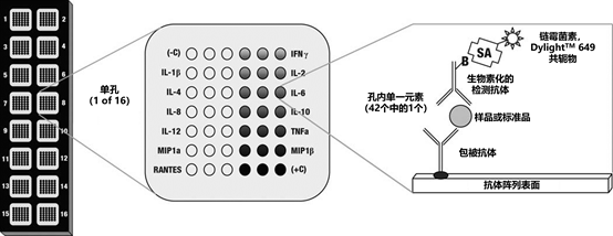 在这种情况下,12种不同的捕获抗体以印刷点阵列的形式涂在玻璃片上。每个抗体捕获不同的分析物,并由其匹配的检测抗体检测,该抗体是生物素化的。最后,所有的斑点都通过荧光标记的链霉菌素结合物(本例中是Thermo Scientific DyLight™ 649荧光基团)。