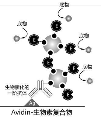 其次,用酶标记链霉菌素分子或使用链霉菌素和生物素化酶的预孵化混合物的过程导至结合物具有一个以上的酶。这种多重标记的综合效果是增加最终免疫复合物中酶分子的数量。这增加了适当底物的催化作用,与传统的酶标记的二阶抗体相比,给出了更强的信号。