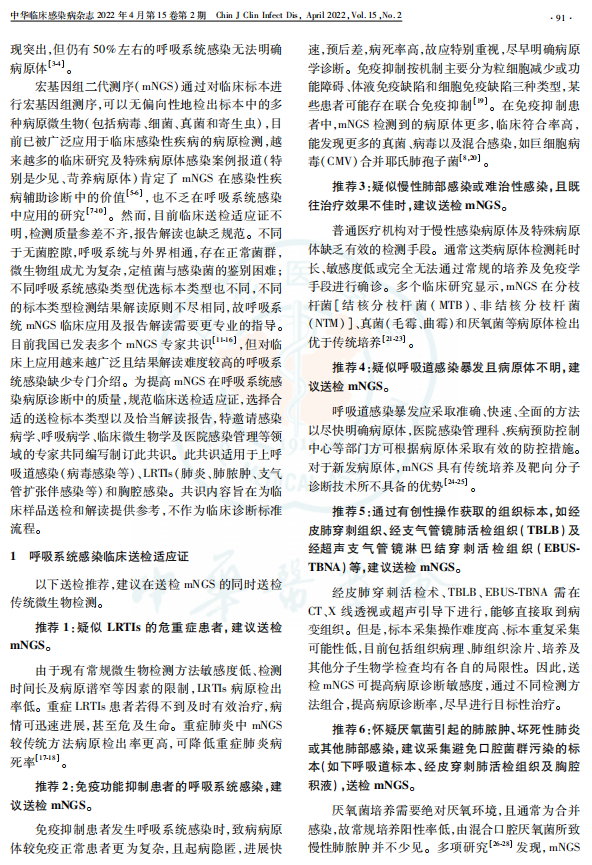 快速、准确的病原学诊断,能尽早选择敏感的抗感染药物或采取有效、具有针对性的防控措施,是感染性疾病精准化防治的核心。宏基因二代测序作为一种新兴的检测技术,能够不依赖微生物培养而检出临床样本中的所有微生物,该技术已在国内被广泛应用,并展现了其快速、无偏倚和高检出的优势。宏基因组二代测序(mNGS)已被广泛应用于感染性疾病的病原检测。然而,呼吸系统感染具有特殊性:病原组成复杂、标本类型选择多样、存在感染与定植、不同标本类型结果解读原则不尽相同等。为规范临床送检适应证,选择合适的送检标本以及恰当地解读报告,特组织专家对上述问题进行讨论并撰写专家共识,以期为呼吸系统感染中mNGS技术临床应用及报告解读提供专业的指导和帮助。【关键词】 呼吸系统感染;宏基因组二代测序;结果解读;专家共识呼吸系统感染是造成全球死亡人数最多的一类感染。2019年世界疾病负担研究学会的数据显示,下呼吸道感染(LRTIs)发病率和病死率在成人和儿童中位居第4位,2019年死亡人数达 260万。呼吸系统感染的病原体种类繁多,病原诊断困难,只有通过快速精准的病原体判断,并进行针对性的抗感染治疗,才能达到最佳的临床预后。虽然近年来分子生物学方法在感染性疾病病原检测中表现突出,但仍有50%左右的呼吸系统感染无法明确病原体。宏基因组二代测序(mNGS)通过对临床标本进行宏基因组测序,可以无偏向性地检出标本中的多种病原微生物(包括病毒、细菌、真菌和寄生虫),目前已被广泛应用于临床感染性疾病的病原检测,越来越多的临床研究及特殊病原体感染案例报道(特别是少见、苛养病原体)肯定了mNGS在感染性疾病辅助诊断中的价值,也不乏在呼吸系统感染中应用的研究。然而,目前临床送检适应证不明,检测质量参差不齐,报告解读也缺乏规范。不同于无菌腔隙,呼吸系统与外界相通,存在正常菌群,微生物组成尤为复杂,定植菌与感染菌的鉴别困难;不同呼吸系统感染类型优选标本类型也不同,不同的标本类型检测结果解读原则不尽相同,故呼吸系统mNGS临床应用及报告解读需要更专业的指导。目前我国已发表多个mNGS专家共识,但对临床上应用越来越广泛且结果解读难度较高的呼吸系统感染缺少专门介绍。为提高mNGS在呼吸系统感染病原诊断中的质量,规范临床送检适应证,选择合适的送检标本类型以及恰当解读报告,特邀请感染病学、呼吸病学、临床微生物学及医院感染管理等领域的专家共同编写制订此共识。此共识适用于上呼吸道感染(病毒感染等)、LRTIs(肺炎、肺脓肿、支气管扩张伴感染等)和胸腔感染。共识内容旨在为临床样品送检和解读提供参考,不作为临床诊断标准流程。以下送检推荐,建议在送检 mNGS的同时送检传统微生物检测。推荐 1:疑似 LRTIs的危重症患者,建议送检mNGS。由于现有常规微生物检测方法敏感度低、检测时间长及病原谱窄等因素的限制,LRTIs病原检出率低。重症 LRTIs患者若得不到及时有效治疗,病情可迅速进展,甚至危及生命。重症肺炎中 mNGS较传统方法病原检出率更高,可降低重症肺炎病死率。推荐 2:免疫功能抑制患者的呼吸系统感染,建议送检 mNGS。免疫抑制患者发生呼吸系统感染时,致病病原体较免疫正常患者更为复杂,且起病隐匿,进展快速,预后差,病死率高,故应特别重视,尽早明确病原学诊断。免疫抑制按机制主要分为粒细胞减少或功能障碍、体液免疫缺陷和细胞免疫缺陷三种类型,某些患者可能存在联合免疫抑制。在免疫抑制患者中,mNGS检测到的病原体更多,临床符合率高,能发现更多的真菌、病毒以及混合感染,如巨细胞病毒(CMV)合并耶氏肺孢子菌。推荐 3:疑似慢性肺部感染或难治性感染,且既往治疗效果不佳时,建议送检 mNGS。普通医疗机构对于慢性感染病原体及特殊病原体缺乏有效的检测手段。通常这类病原体检测耗时长、敏感度低或完全无法通过常规的培养及免疫学手段进行确诊。多个临床研究显示,mNGS在分枝杆菌[结核分枝杆菌(MTB)、非结核分枝杆菌(NTM)]、真菌(毛霉、曲霉)和厌氧菌等病原体检出优于传统培养。推荐 4:疑似呼吸道感染暴发且病原体不明,建议送检 mNGS。呼吸道感染暴发应采取准确、快速、全面的方法以尽快明确病原体,医院感染管理科、疾病预防控制中心等部门方可根据病原体采取有效的防控措施。对于新发病原体,mNGS具有传统培养及靶向分子诊断技术所不具备的优势。推荐 5:通过有创性操作获取的组织标本,如经皮肺穿刺组织、经支气管镜肺活检组织(TBLB)及经超声支气管镜淋巴结穿刺活检组织 (EBUS TBNA)等,建议送检 mNGS。经皮肺穿刺活检术、TBLB、EBUS TBNA需在CT、X线透视或超声引导下进行,能够直接取到病变组织。但是,标本采集操作难度高、标本重复采集可能性低,目前包括组织病理、肺组织涂片、培养及其他分子生物学检查均有各自的局限性。因此,送检 mNGS可提高病原诊断敏感度,通过不同检测方法组合,提高病原诊断率,尽早进行目标性治疗。推荐 6:怀疑厌氧菌引起的肺脓肿、坏死性肺炎或其他肺部感染,建议采集避免口腔菌群污染的标本(如下呼吸道标本、经皮穿刺肺活检组织及胸腔积液),送检 mNGS。厌氧菌培养需要绝对厌氧环境,且通常为合并感染,故常规培养阳性率低,由混合口腔厌氧菌所致慢性肺脓肿并不少见。多项研究发现,mNGS在厌氧菌诊