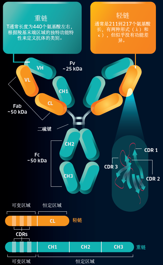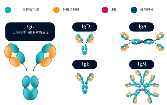 抗体是免疫系统的一个重要组成部分,在我们抵抗感染的能力和疫苗接种的效果方面起着关键作用。然而,这并不是它们效用的终点。 抗体可以作为一种生物制药产品,用于诊断测试,并作为一种分析工具进行检测。在本文中,我们将仔细看看什么是抗体,它们来自哪里,它们如何发挥作用,以及科学如何将它们在实验室中发挥作用。 1、简明抗体历史 2、什么是抗体? 抗体的基本形式是Y型糖蛋白,由四个多肽链组成,两个相同的重链和两个相同的轻链,通过二硫键连接。 抗体利用其结构的不同区域执行两种主要功能: ➤ 可结晶片段(Fc)区域与免疫系统(如吞噬细胞和赞美系统)相互作用,以促进抗原清除。 ✔ Fc区由两个恒定结构域(CH2和CH3)组成,使其能够相互作用并持续发挥其功能。 ➤ 抗原结合片段(Fab)可以识别抗原。 ➤ Fab包含四个结构域: ✔ 两个可变结构域(VH和VL),它们统称为可变片段(Fv),提供抗原特异性。 ✔ 两个恒定结构域(CL和CH1),提供一个结构框架。 每个可变结构域包含三个高变异环,称为互补性决定区(CDR1、CDR2和CDR3)。它们的高变异性使抗体能够识别几乎无限数量的可变常数抗原。 4. 当新生或记忆B细胞上的免疫球蛋白成功结合其目标抗原时,它们会增殖并分化为分泌抗体的B细胞。 5. 这些分泌型B细胞成熟为大型浆细胞,以每秒约2000个分子的速度持续分泌抗体。 6. 在血液循环中,浆细胞持续几天,但可以在骨髓中持续几个月甚至几年。 免疫球蛋白和抗体非常相似。然而,免疫球蛋白有一个跨膜结构域,并附着在B细胞的表面。B细胞的表面,而抗体缺乏这个结构域,因此被释放到循环中。 4、抗体是如何工作的? 抗体通过Fab区与它们的目标抗原结合,它们可以通过几种不同的机制发挥作用。 5、抗体的种类 在人类血清中发现有五类抗体,也被称为同种型,根据它们拥有的重链来区分。下表总结了这些情况。 IgD、IgE和IgG通常以单体形式存在,而IgA通常以二聚体形式存在,IgM以五聚体形式存在。 还有三类抗体被认可,但在哺乳动物中没有发现。 等位基因的变化,有时与某些种族群体有关,甚至在抗体亚型中也可能存在。这些被称为异型。 6、单克隆抗体与多克隆抗体 ➤ 多克隆抗体:抗体是一组非相同的抗体,它们都对同一抗原有亲和力,但与一系列不同的表位结合。 ➤ 单克隆抗体:抗体是一组来自同一母体克隆的完全相同的抗体,对同一表位有亲和力。 我们在应对入侵者时自然会产生多克隆抗体,这些抗体通常很适合于许多研究应用。然而,单克隆抗体可以在体外产生,用于需要它们的应用,例如用于治疗。 7、抗体的应用 虽然抗体是我们免疫系统的一个非常重要的产品,但它们也可以被用于有效的治疗,并为实验室中的各种检测提供有用的工具。 7.1、基于抗体的治疗方法 治疗性抗体,其中大部分是单克隆抗体,现在是增长最迅速的一类获批的生物制药药物,用于治疗包括癌症、自身免疫和炎症性疾病以及阿尔茨海默氏病。 抗体是选择针对体内特定的问题抗原,阻断它们的正常作用,从而减少或预防它们引起的病症。 通常情况下,单克隆抗体被用于治疗,因为它们的批次间差异很小,可以大量生产,而且非常具有特异性,几乎不产生交叉反应的结合。然而,它们的生产成本很高,也很耗时。 7.2、基于抗体的检测方法 利用抗体的检测主要是为了检测,可以分成两组: ➤ 检测抗体的检测法; ➤ 利用抗体来检测目标分子的检测方法。 这些包括: ➤ 酶联免疫吸附试验(ELISA),直接法和夹心法 ➤ Western blot ➤ 侧向层析(LFA) ➤ 免疫组化法,用显微镜标记 抗体对于诊断性测试特别有用,例如: ➤ 通过使用特定的抗体检测,确定样品中是否存在抗原,如病原体表面蛋白,识别活动性感染 ➤ 检测某人是否正在积极产生病原体的抗体,因此正在或已经被感染,例如新冠病毒抗体测试。 通常情况下,多克隆抗体被用于检测,因为它们很便宜,并且具有较高的整体亲和力和检测多个表位的灵敏度。然而,市面上生产的抗体存在批次间的差异问题,而且它们会因为交叉反应的结合而增加背景‘噪音’。 |