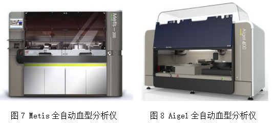 2015年,深圳市爱康生物的微孔板式全自动血型分析仪Metis(图7)获批上市,2016年,其微柱凝胶全自动血型分析仪Aigel(图8)获批上市,两者均可进行人类血型ABO正反定型、Rh(D)血型定型、不规则抗体筛选和交叉配血试验。深圳市爱康生物成为国内唯一一家拥有基于微孔板式及微柱凝胶两种技术的全自动血型分析仪的企业。