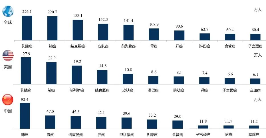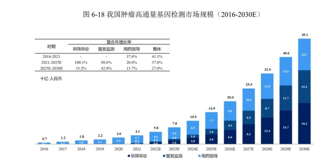 近年来,国家政策端对肿瘤早筛领域给予大力支持,相继出台多项重磅政策。2022年4月2日,健康中国行动推进委员会办公室发布《健康中国行动2022年工作要点》,旨在从政策层面推广普及肿瘤早筛,深入构建全国性的肿瘤防治体系。2021年10月15日,卫健委等部门联合发布《关于印发肿瘤诊疗质量提升行动计划的通知》,部署2021—2024年间开展肿瘤质量提升行动计划,明确提出推进肿瘤早期筛查。此外,在多项国家发展规划中都表示,将基因检测作为重点发展的新兴产业,全力推动癌症早诊早治。 之所以如此重视肿瘤早筛早诊,与当前我国肿瘤患病人数与日攀升,抗癌形势突出不无关系。据Globocan 2020年数据统计,中国每年新发癌症病例457万例,死亡病例300万例,均居全球首位。据国家癌症中心、Frost & Sullivan数据,我国恶性肿瘤发病人数逐年上升,预计2025年患病人数为520万人,2030年将达580万人。从肿瘤流行病学来看,当前我国肺癌发病情况高居首位,其次是胃癌,而且整体五年生存率均显著低于美国,究其原因即中国癌症患者初诊的晚期比例远高于美国,说明国内肿瘤早筛普及率较低,仍有大幅上升空间。 高居不下的患者、艰巨的抗癌任务及国家政策的大力鼓舞,在多重因素交织下国内肿瘤检测市场亟待爆发。据 Frost & Sullivan 数据,国内肿瘤高通量基因检测市场规模由2016年的7亿元至增至2021年41亿元,复合年增长率为41.1%。预计2025年和2030年,市场规模将分别达到 149 亿元和 491 亿元,呈现快速增长态势。尤其是肿瘤早筛早诊市场,在2021到2025年间预计年复合增长率高达100.1%,远超过用药指导,越发向治未病的医疗理念靠拢。这是医学发展的必然趋势。 全球及中美前十大新发癌症(2020) 我国肿瘤基因检测市场规模(2016—2030E) 来源:Frost & Sullivan 、世和基因招股书 肿瘤基因检测的完整闭环包含四大维度:预防、早筛、诊疗和监测。其中早筛目前涉及的检测癌种有肠癌、肺癌、肝癌、胃癌、乳腺癌、宫颈癌、泌尿肿瘤等。从技术层面可划分为影像学检查、内镜检查、穿刺诊断、组织活检等物理手段、肿瘤标志物检测的生化手段及液体活检的分子诊断。 从特点上分析,影像学和内镜检查依赖于专业医师、技师、护理人员经验和设备水平;肿瘤标志物检测的灵敏度、特异性不够,多用于辅助诊断;穿刺诊断侵入性强,多用于术中和术后,早筛应用较少;唯有近年来兴起的液体活检取样简单可重复,泛癌种或单癌种检测均能应对,更能满足众多高风险人群的筛查需求,必将成为未来大规模筛查的主要手段。 液体活检是一种非侵入式的血液测试,通过采集患者发病部位的体液,如血液、唾液、汗液、粪便、尿液及分泌物等,监测肿瘤或转移灶释放到血液的循环肿瘤细胞(CTC)、循环肿瘤DNA(ctDNA)碎片以及外泌体(Exosome)。该技术核心在于检测微量核酸变异,包括点突变、染色体结构变异及表观遗传学如甲基化水平分析等,以下重点介绍液体活检技术及相关产品研发进展。 各种肿瘤早筛的技术特点对比 来源:中信证券 CTC检测