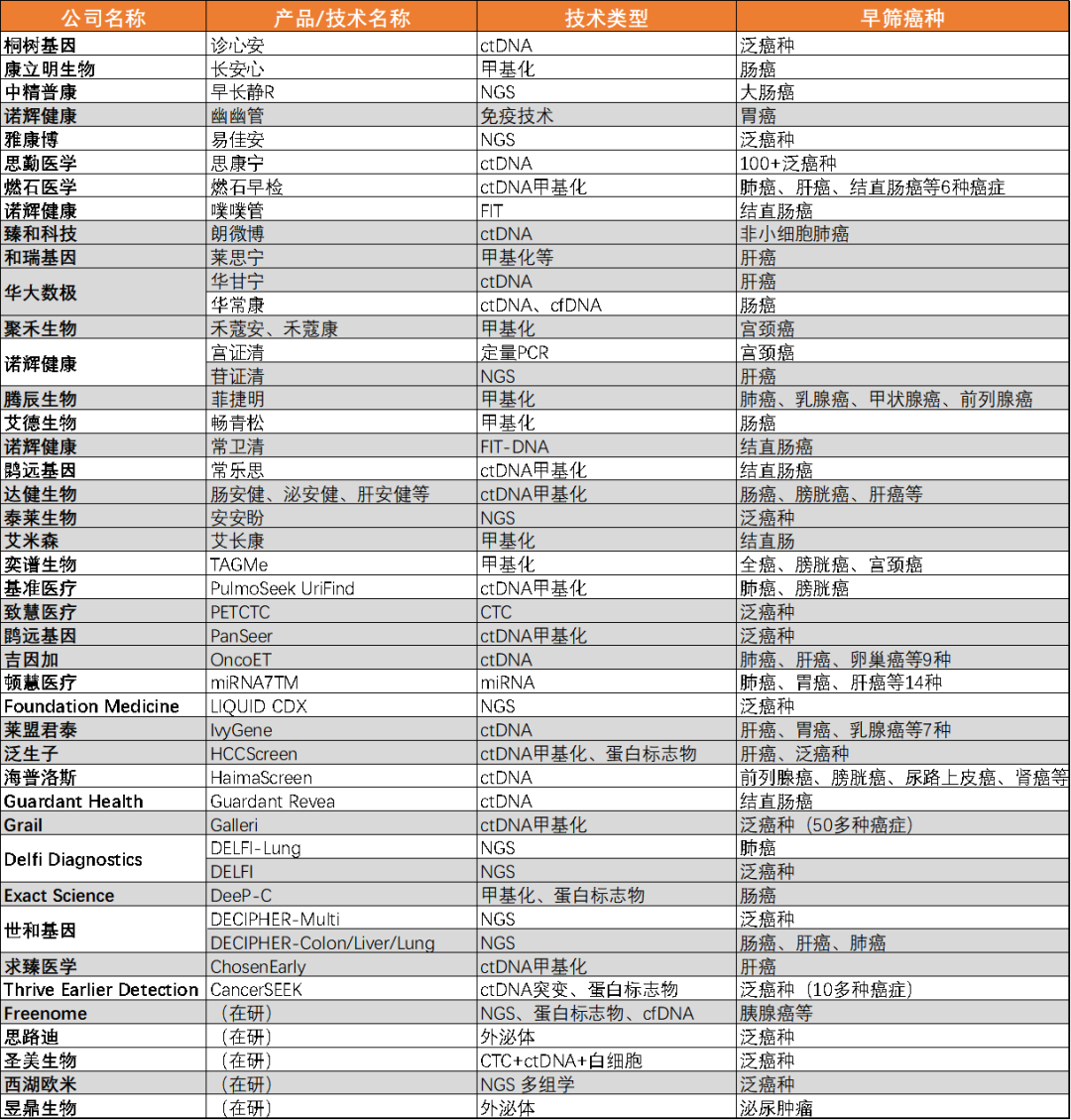 为了检测血液中含量极低且微小的CTC肿瘤细胞,有研究者运用ISET联合激光扫描细胞计量仪(结合流式细胞技术、微流控技术、纳米技术)检测CTC,其原理是从外周血细胞中分离肿瘤细胞,再利用LSC(laser scanning cytometry)对已经标记荧光抗体的细胞进行扫描识别,从而准确检测到外周血中所含有的极微量肿瘤细胞。 以九强生物入股的中科纳泰为例,它是一家肿瘤早期筛查和个性化诊断服务商,即通过多肽纳米磁珠捕获和分离循环肿瘤细胞的“肿瘤捕手”技术(TumorFisher CTC),高灵敏检测1—5mm肿瘤,再进一步提供预防监控等系列方案。其他见诸报道的还有圣美生物研发的CTC富集分离平台、TellBio开发的CTC检测技术平台、Ikonisys的CTC检测平台、浚慧生物的单细胞检测平台、杭州华得森CTC检测系统、德运康瑞单细胞检测技术、Datar Cancer Genetics的乳腺癌CTC检测、Rarecells开发的分离平台ISET以及塞特生物的差相富集和瘤标免疫荧光染色-染色体荧光原位杂交整合技术检测CTC等。CTC行业整体已步入快车道,新技术推陈出新,捕获效率、捕获丰度不断提高。 ctDNA/cfDNA检测 来源肿瘤的游离细胞外的DNA(cell-free DNA,cfDNA)就称为ctDNA。血液中cfDNA常维持较低水平,但在急性损伤、感染或较大手术等情况下,其含量会明显升高,肿瘤中cfDNA含量也较高。ctDNA来源包括坏死或凋亡的肿瘤细胞、CTC以及肿瘤细胞产生的外排。由于ctDNA数量较少、需要扩增、检测方式灵敏度较低,使其检测在临床实际应用中面临巨大挑战。目前ctDNA主要检测手段有Sanger法、二代测序NGS、实时荧光定量聚合酶链反应RT-qPCR、扩增受阻突变系统ARMS-PCR、数字PCR(包括磁珠乳液扩增技术BEAMing和微滴式数字PCR)、靶向深度测序技术等。 各种ctDNA检测技术特点对比 来源:肿瘤综合治疗电子杂志 例如,华大基因旗下的肿瘤早筛子公司华大数极,已推出无创肠癌基因检测华常康和无创肝癌基因检测产品华甘宁。前者利用人的粪便作为检测样本,提取肠道脱落细胞包含的DNA进行检测,可以早期发现息肉、腺瘤等癌前病变和早期肠癌。检测灵敏度显著优于粪便隐血(FIT)检测,且可居家自取样、无创无痛。后者采用cfDNA液体活检技术,结合肝癌甲基化标志物,通过检测cfDNA携带的异常甲基化信号和统计模型分析,确定受检者罹患肝癌的风险,助于及早诊断肝癌的发生。 另一家肿瘤早筛佼佼者泛生子,也是肝癌早筛的领头企业,实际上其核心原研技术Mutation Capsule不仅应用于无症状期超早期肝癌的发现,也能检测外周血中cfDNA的多种甲基化和基因突变信息,实现泛癌种检测。 外泌体检测 外泌体是细胞向胞外分泌的大小均一的囊泡类小体,直径30-100nm,具有典型的脂质双分子膜结构,存在于细胞培养上清液、血清、唾液、尿液及其他体液中。外泌体携带有母细胞的多种成分,如融合基因(如EML4-ALK和ACR-ABL)、特异性RNA突变(BRAF、KRAS和EGFR突变)、选择性剪接亚型(如MET14外显子跳跃突变)、非编码RNA(miRNA、lncRNA、circRNA)、蛋白、脂质代谢物等均可作为肿瘤生物标志物。 研究表明外泌体可能在细胞间的物质交流和信息传递中发挥一定作用,含有这些核酸的外泌体不仅能够反映肿瘤的遗传信息,还可以随体液传播到远处并将核酸转移至受体细胞诱导其表型改变。此外,由于外泌体的包裹,使得细胞外RNA能够稳定存在于血液和其他体液中,捕获这些外泌体并检测其中的核酸成为无创筛查肿瘤的手段。目前外泌体检测已经应用于多种癌症的筛查,包括乳腺癌、卵巢癌、胰腺癌、胶质瘤、肺癌、肝癌。 以热景生物为例,其自主研发了糖链外泌体、DNA甲基化的液体活检肿瘤早筛技术,并战略投资翱锐生物,共同在肝癌早筛早诊领域开展合作。热景生物基于糖捕获技术推出的“GlyExo-Capture®外泌体快速分离系统”,具有快速分离、高通量、多样本类型、全自动等特点,相比传统的外泌体提取方法——超速离心法、聚乙二醇沉淀法、尺寸排阻色谱法,只需11分钟即可获得完整且有活性的外泌体,极大提高检测效率。 甲基化检测 研究发现,DNA甲基化的异常改变早于肿瘤的形成和发展,因此特定基因的异常甲基化可作为肿瘤早期诊断的标志物,且特异基因甲基化标记组合相较于单一的基因甲基化标志物,对肿瘤的早期诊断有更高的敏感度。在癌症早期,癌组织DNA进入血液形成ctDNA,取受检者少量外周血样本,通过检测ctDNA携带的异常甲基化信号便能获取癌症信号并定位癌变部位,这点在鼻咽癌、子宫颈癌的早筛检测中已得到验证。 2021年10月,北京市医疗保障局签发的《关于规范、调整物理治疗类等医疗服务价格项目的通知》,将基因甲基化检测作为癌症早诊医疗服务项目纳入甲类医保报销范围,表明甲基化检测技术发展成熟,已成为肿瘤早期筛查的重要标志物。 肿瘤相关基因甲基化及其作用 来源:《实用肿瘤》 分析肿瘤早筛领跑企业,海外有Guardant Health,Grail,Foundation Medicine, Exact Science等,国内有燃石医学、世和基因和泛生子等,其市场份额均排名前列。上游NGS基因检测服务企业有华大基因、诺禾致源等,设备制造企业有illumina,Pacbio等。目前来看,肿瘤早筛行业还处于早期发展阶段,市场格局较为分散,同时整体缺乏统一标准,各家产品服务不尽相同。未来如何尽快抢占市场先机,占领用户心智,还需从产品定位、消费场景、商业路径、推广宣发等多维度战略性设计,只有全盘考虑各种
