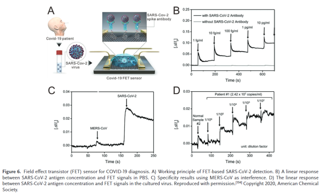 Seo等科学家基于场效应晶体管(Field-effect transistor,FET)设计了一种电化学生物传感器,可用于临床样本检测SARS-CoV-2。该技术的原理是通过在FET的石墨烯电极片上用1-芘丁酸N-羟基琥珀酰亚胺酯(PBASE)进行修饰,并将其作为界面偶联剂固定SARS-CoV-2刺突蛋白特异性抗体后,用磷酸盐缓冲盐水(PBS,pH 7.4)完全覆盖FET作为电解质,基于管道的表面的电位变化和对电响应影响实现了SARS-CoV-2的临床样本检测。该技术具有成本低、灵敏度高、动态响应范围广等优势,无需对样品进行任何预处理或标记,属于高灵敏免疫学诊断方法。  1、Advanced Point-of-Care Testing Technologies for Human Acute Respiratory Virus Detection2、Micro/nano biomedical devices for point-of-care diagnosis of infectious respiratory diseases3、李婕云小综述:逆转录聚合酶链式反应技术(RT-PCR)的发展4、滚环扩增信号放大技术在生物检测中应用的研究进展7、CRISPR/Cas系统在感染性疾病诊断种的应用 9、CRISPR/Cas系统分类和病原体检测的研究进展10、基于表面等离子体共振技术检测病原细菌的研究进展11、基于纳米信号标签的表面增强拉曼散射在病原菌检测中的应用 |