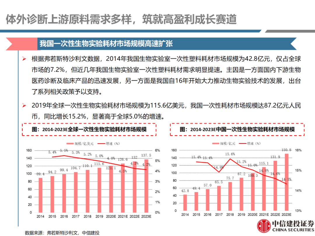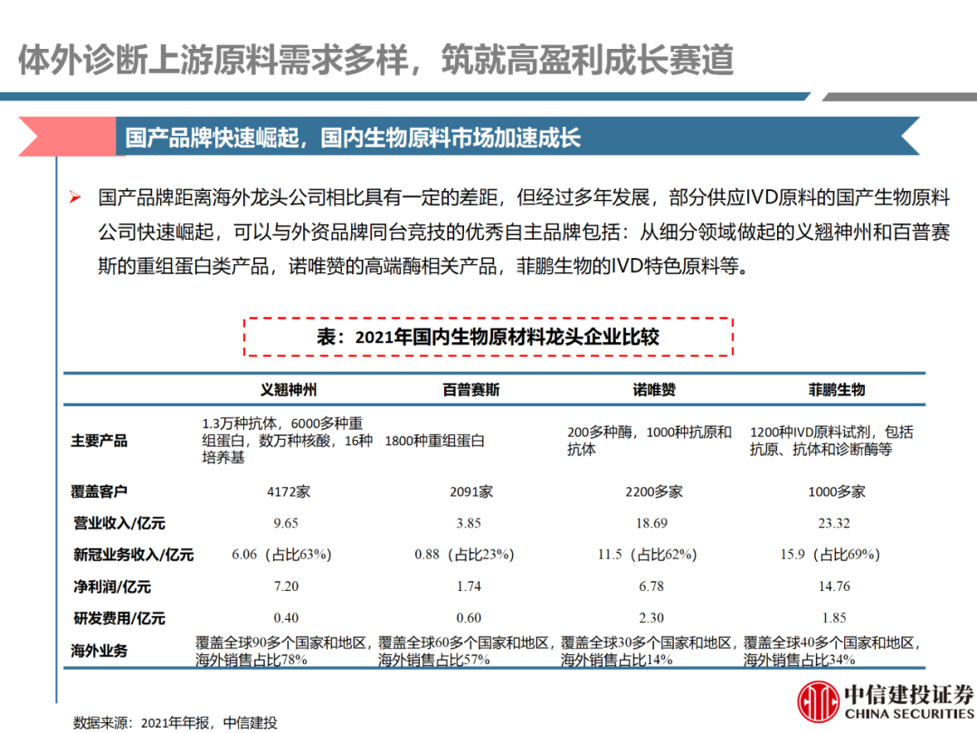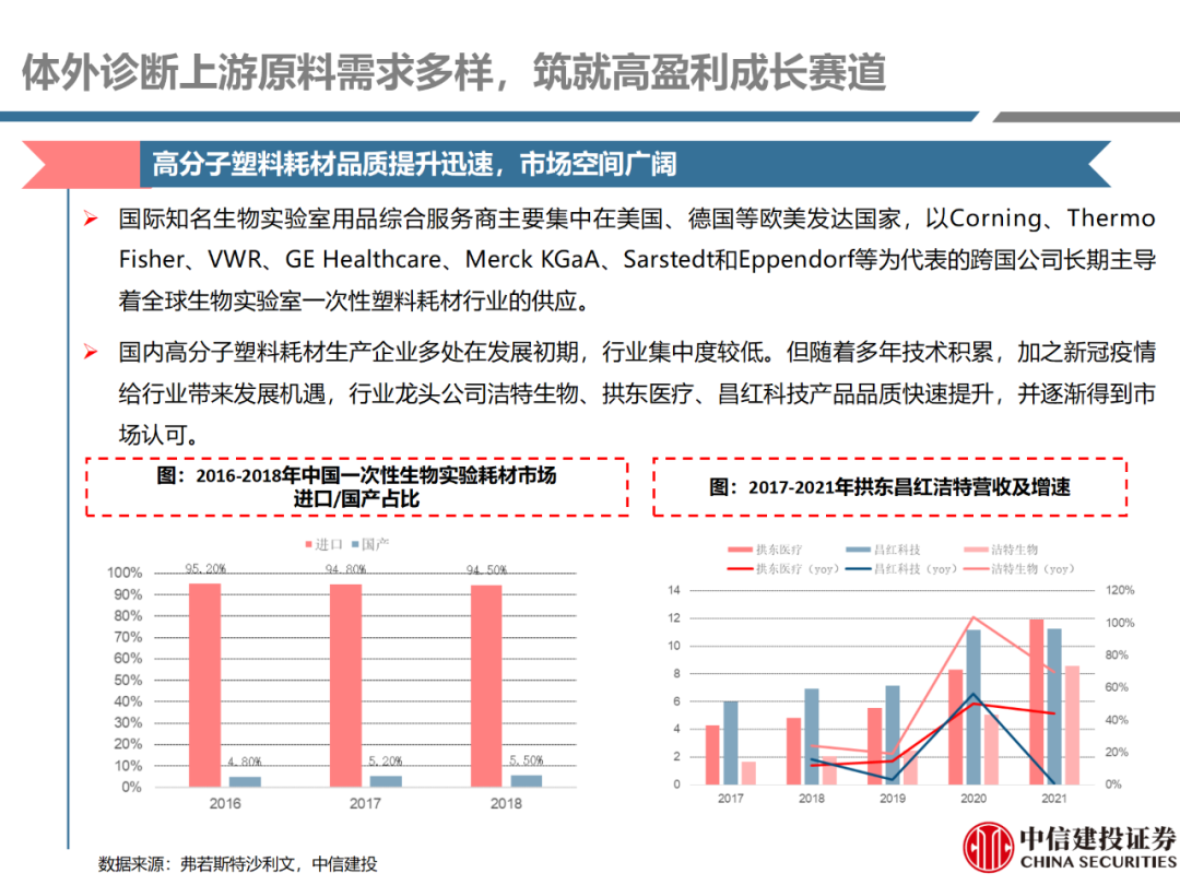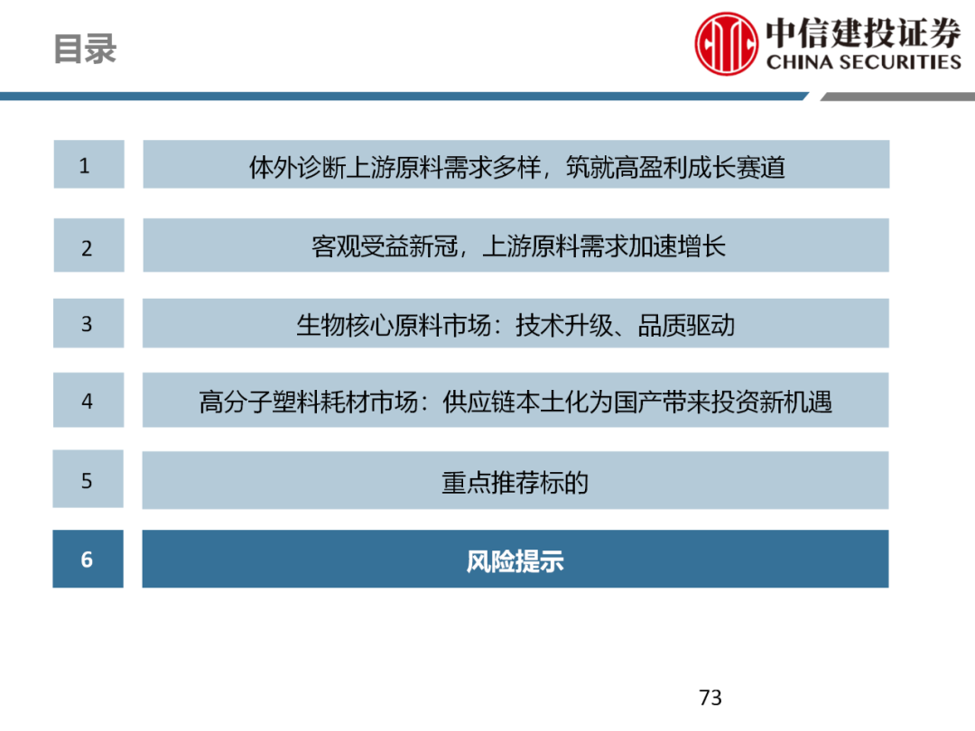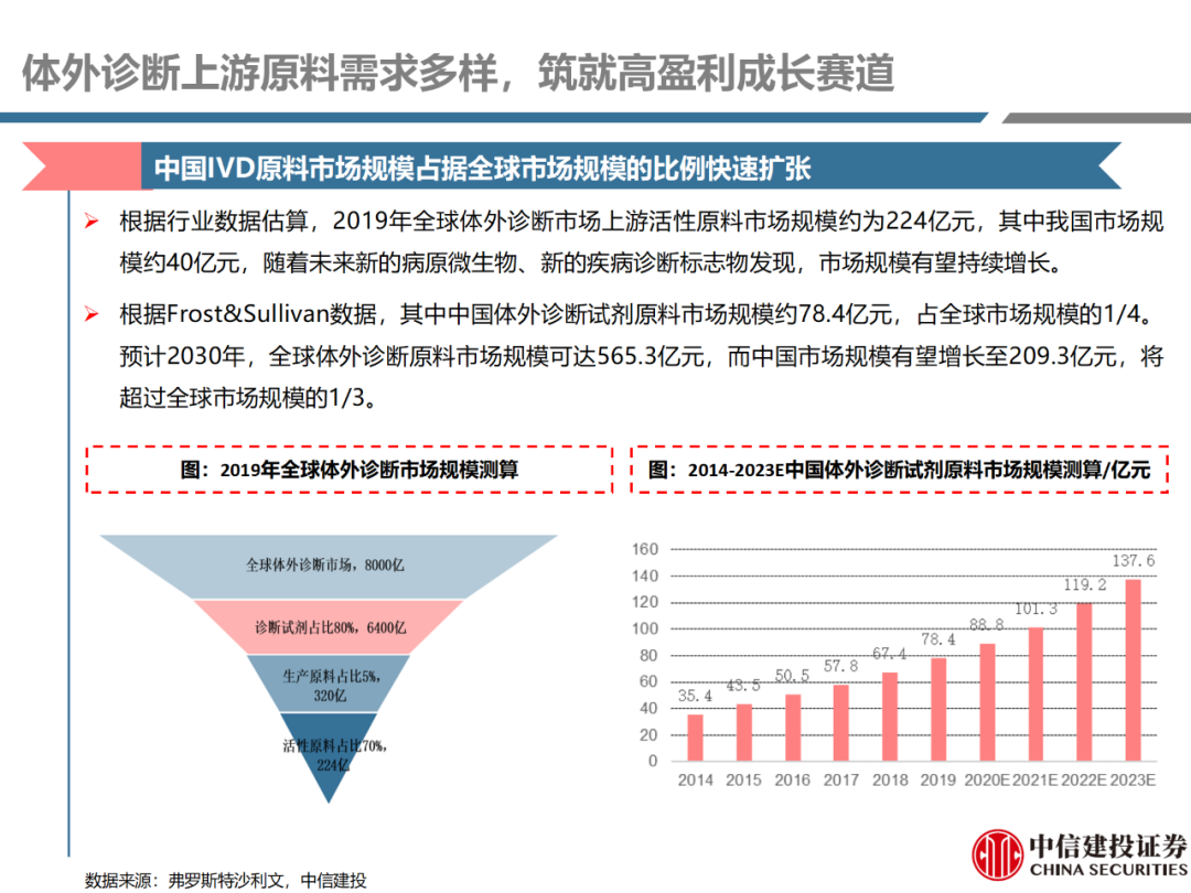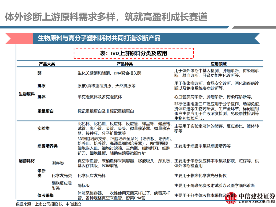 | 体外诊断上游原料需求多样,多因素推动行业高增长。IVD上游原料种类复杂,包括生物原料、塑料制品和支持性材料等。2019年全球体外诊断试剂原料市场规模预计约为303.3亿元,其中中国市场的规模预计约为62.9亿元。全球生物原料龙头赛默飞及高分子塑料龙头康宁凭借多年积累的核心技术及全面的产品布局,业绩持续实现稳健增长并取得可观的股价回报。国产品牌经过多年积累,逐渐掌握核心技术、丰富产品品类,新冠疫情爆发客观上对抗原抗体、分子酶等生物原料及高分子塑料耗材产品带来巨大需求,国内厂家近两年借此加速成长。生物核心原料:技术升级、品质驱动,国产份额快速提升。生物核心原料产品主要包括抗原、抗体、诊断酶等,疫情前takara等进口品牌占有国内80%以上市场份额。国产龙头企业多年来持续研发投入,基因工程技术用于生物原料产品的研发和生产已臻于成熟。新冠核酸、抗原及抗体检测带来上游原料的爆发性增长,国产品牌在取得大额现金流的同时,从“质量+品类+价格+效率+服务”全方位发力,国产品牌竞争力显著提升。高分子塑料耗材:“全球新冠疫情+国内IVD集采”加速供应链的本土化。体外诊断上游原料产品有反应杯、培养皿、纳米微球、NC膜等高端耗材,产品种类复杂,技术难度不一,低端产品国产化程度高,高端产品主要依赖进口。2020年新冠疫情使得全球供应链受阻,物流成本大幅增加,催使全球IVD龙头与国内供应商深度合作;此外IVD试剂集采降价压力下,国内龙头厂家也在寻找性价比更高的国内供应商,进口品牌本土化+IVD集采为国内高分子塑料耗材厂家带来良好的发展机遇。行业相关标的梳理:从“技术平台+产品”的角度,我们建议关注:诺唯赞(以高端酶为特色的生物试剂龙头)、义翘神州(蛋白试剂数量全球领先)、百普赛斯(重点布局重组蛋白)、拱东医疗(以定制业务和功能性耗材为特色)、昌红科技(高分子塑料耗材隐形冠军)、洁特生物(实验室高端耗材供应国内领先)、关注IPO已过会的菲鹏生物(IVD核心原料供应商)及近岸蛋白、康为世纪等。风险提示:新业务拓展不达预期的风险;新冠检测业务下滑过快,行业产能过剩的风险;新进入市场企业快速增加致价格大幅下降的风险;工业客户产品集采致价格下滑进而被动降价的风险。