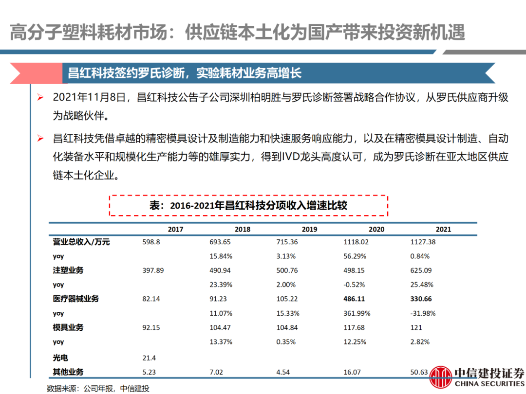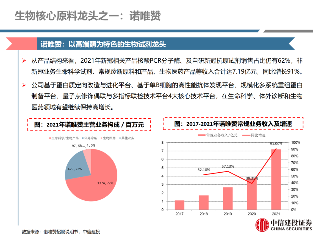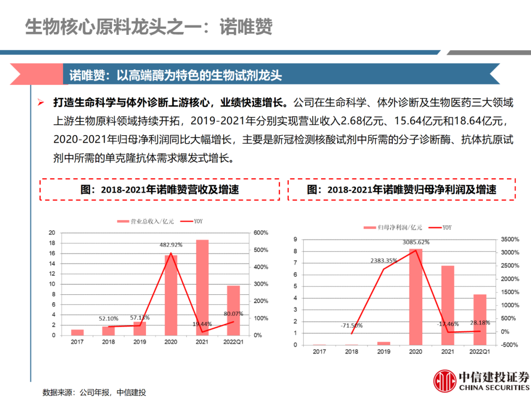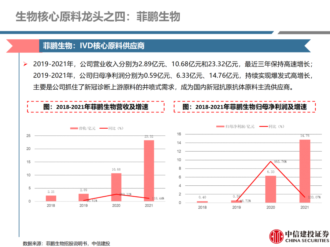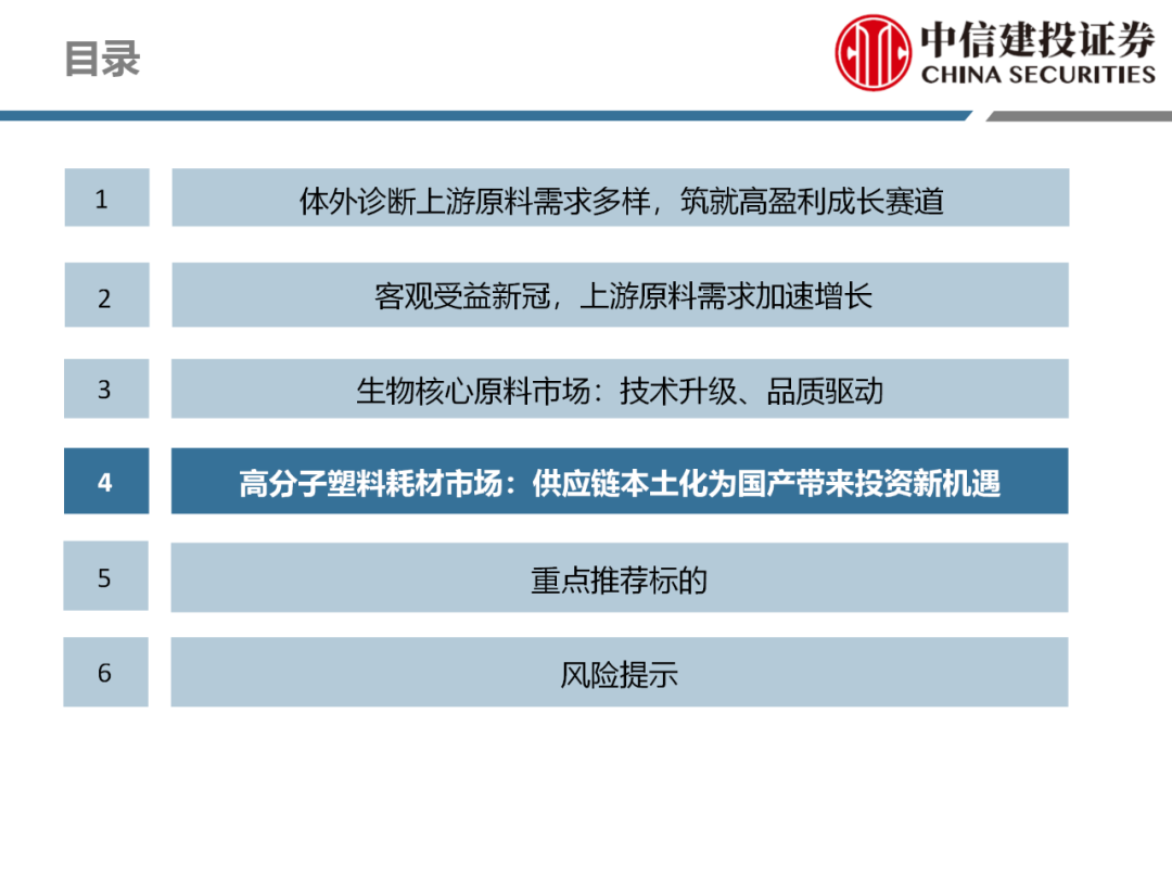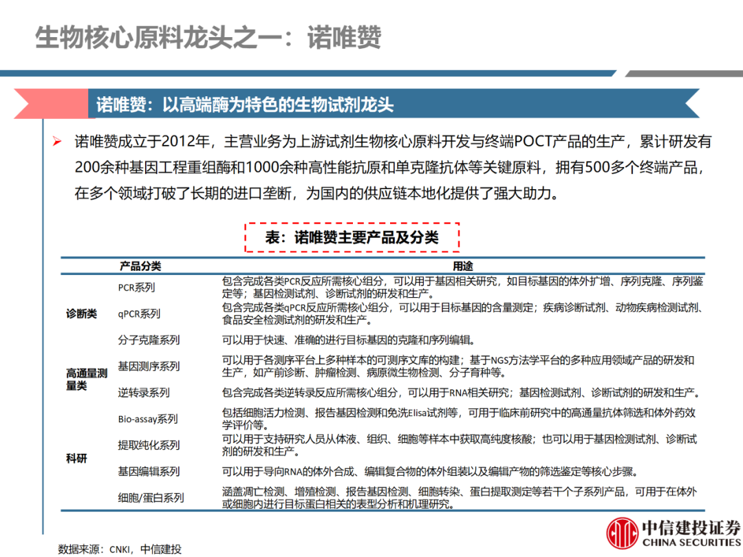 | 体外诊断上游原料需求多样,多因素推动行业高增长。IVD上游原料种类复杂,包括生物原料、塑料制品和支持性材料等。2019年全球体外诊断试剂原料市场规模预计约为303.3亿元,其中中国市场的规模预计约为62.9亿元。全球生物原料龙头赛默飞及高分子塑料龙头康宁凭借多年积累的核心技术及全面的产品布局,业绩持续实现稳健增长并取得可观的股价回报。国产品牌经过多年积累,逐渐掌握核心技术、丰富产品品类,新冠疫情爆发客观上对抗原抗体、分子酶等生物原料及高分子塑料耗材产品带来巨大需求,国内厂家近两年借此加速成长。生物核心原料:技术升级、品质驱动,国产份额快速提升。生物核心原料产品主要包括抗原、抗体、诊断酶等,疫情前takara等进口品牌占有国内80%以上市场份额。国产龙头企业多年来持续研发投入,基因工程技术用于生物原料产品的研发和生产已臻于成熟。新冠核酸、抗原及抗体检测带来上游原料的爆发性增长,国产品牌在取得大额现金流的同时,从“质量+品类+价格+效率+服务”全方位发力,国产品牌竞争力显著提升。高分子塑料耗材:“全球新冠疫情+国内IVD集采”加速供应链的本土化。体外诊断上游原料产品有反应杯、培养皿、纳米微球、NC膜等高端耗材,产品种类复杂,技术难度不一,低端产品国产化程度高,高端产品主要依赖进口。2020年新冠疫情使得全球供应链受阻,物流成本大幅增加,催使全球IVD龙头与国内供应商深度合作;此外IVD试剂集采降价压力下,国内龙头厂家也在寻找性价比更高的国内供应商,进口品牌本土化+IVD集采为国内高分子塑料耗材厂家带来良好的发展机遇。行业相关标的梳理:从“技术平台+产品”的角度,我们建议关注:诺唯赞(以高端酶为特色的生物试剂龙头)、义翘神州(蛋白试剂数量全球领先)、百普赛斯(重点布局重组蛋白)、拱东医疗(以定制业务和功能性耗材为特色)、昌红科技(高分子塑料耗材隐形冠军)、洁特生物(实验室高端耗材供应国内领先)、关注IPO已过会的菲鹏生物(IVD核心原料供应商)及近岸蛋白、康为世纪等。风险提示:新业务拓展不达预期的风险;新冠检测业务下滑过快,行业产能过剩的风险;新进入市场企业快速增加致价格大幅下降的风险;工业客户产品集采致价格下滑进而被动降价的风险。