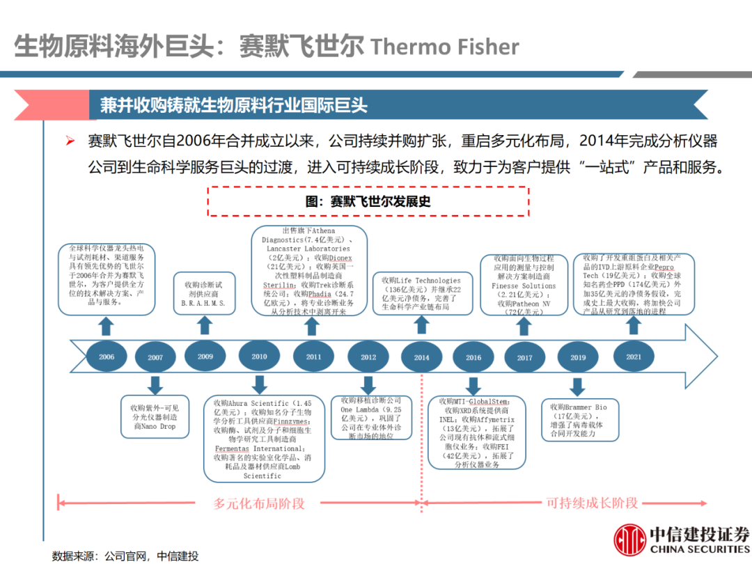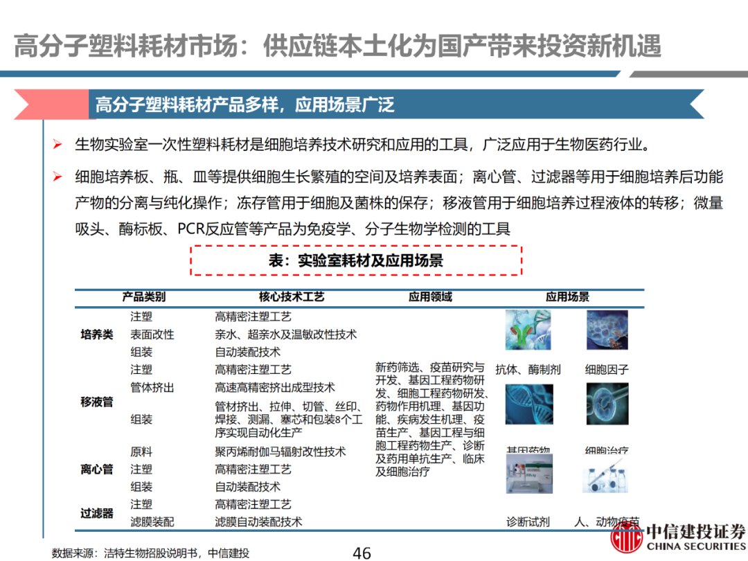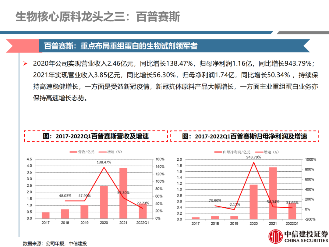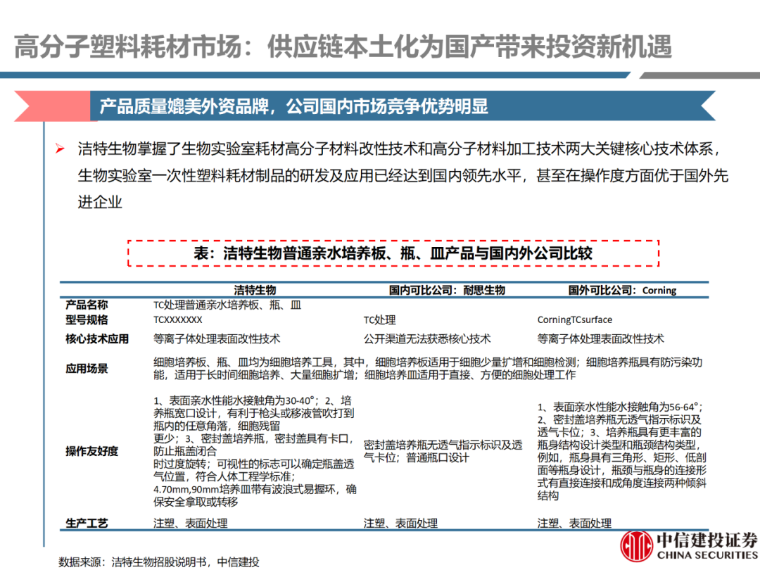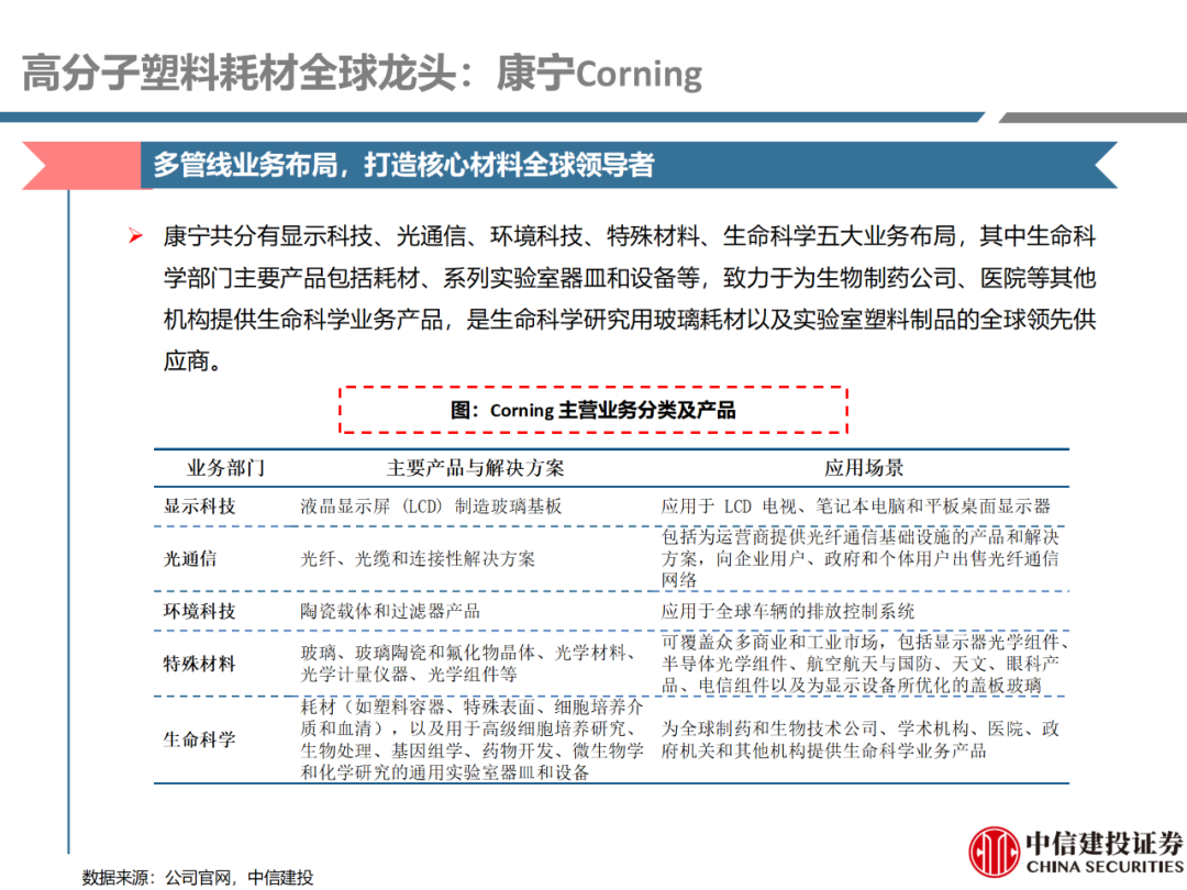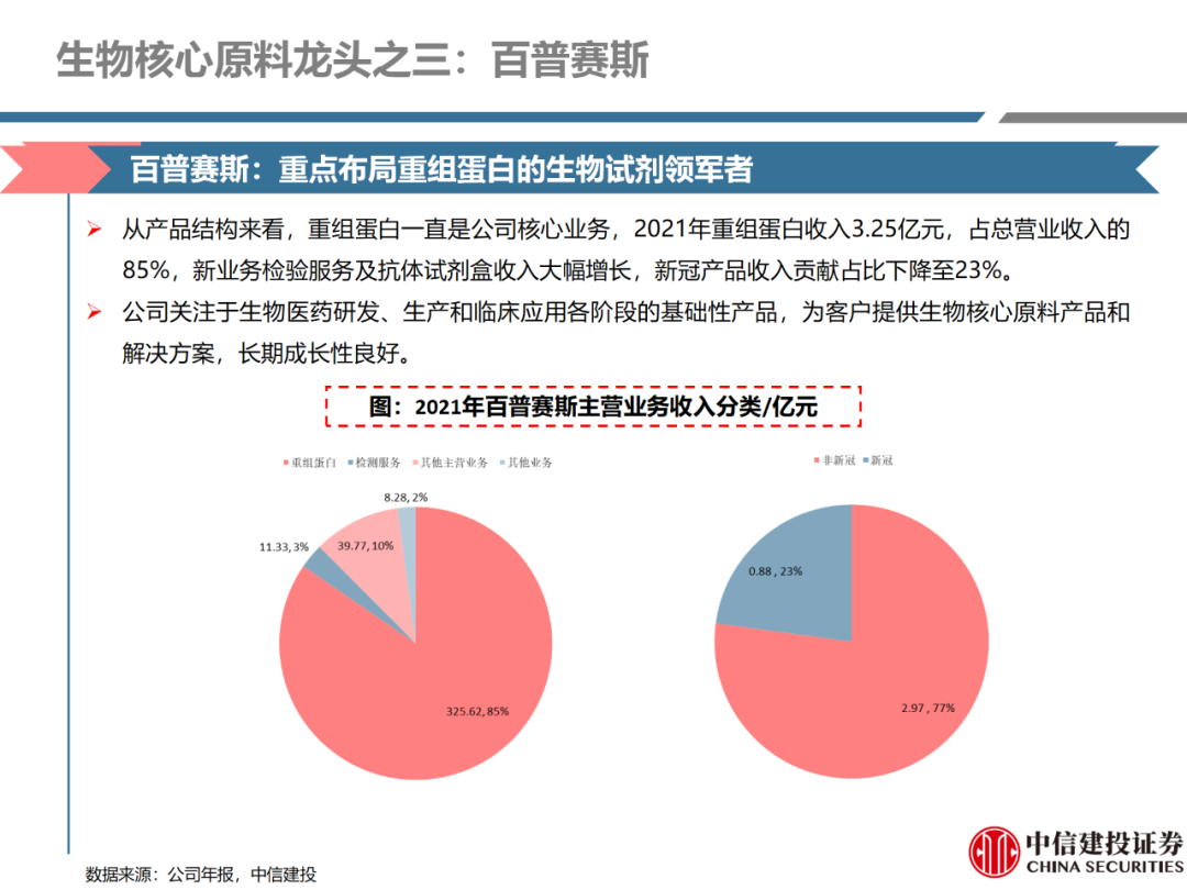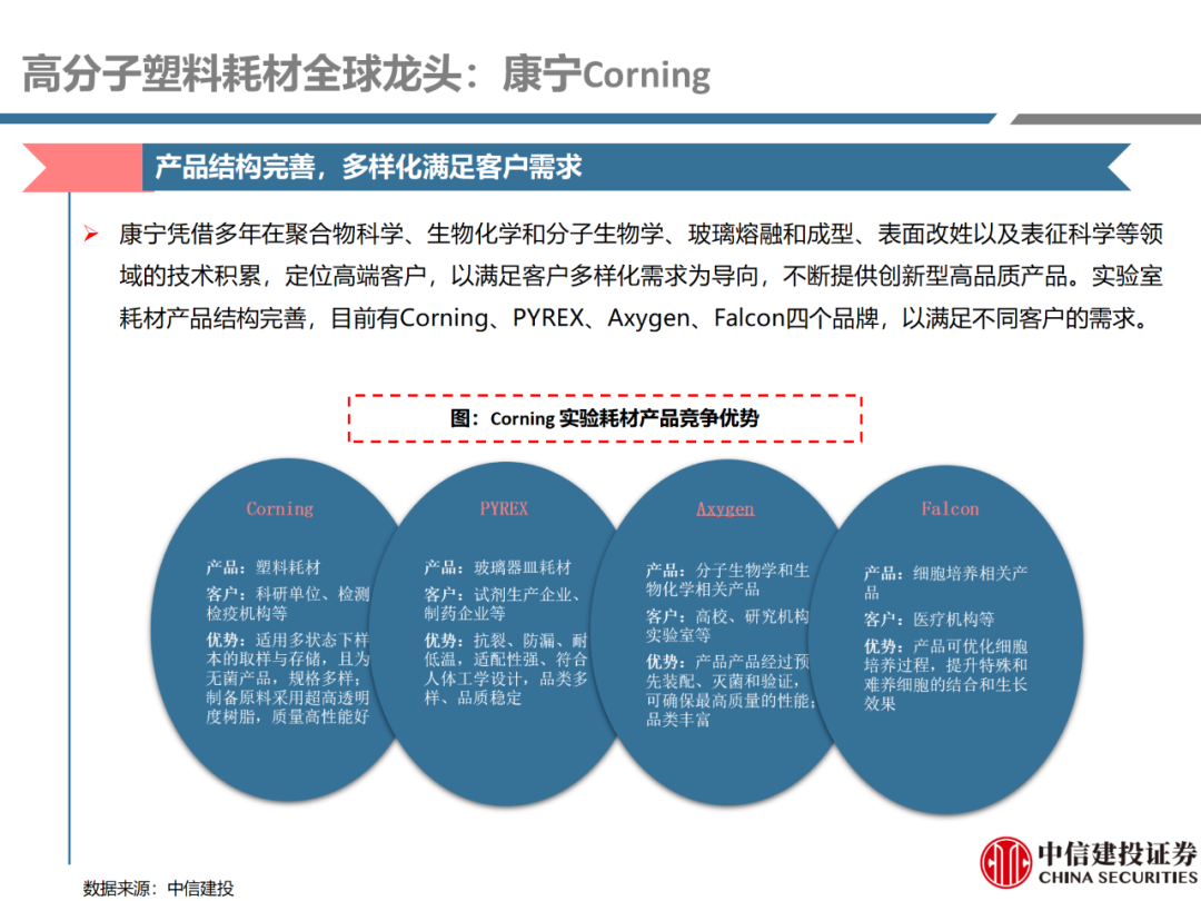 | 体外诊断上游原料需求多样,多因素推动行业高增长。IVD上游原料种类复杂,包括生物原料、塑料制品和支持性材料等。2019年全球体外诊断试剂原料市场规模预计约为303.3亿元,其中中国市场的规模预计约为62.9亿元。全球生物原料龙头赛默飞及高分子塑料龙头康宁凭借多年积累的核心技术及全面的产品布局,业绩持续实现稳健增长并取得可观的股价回报。国产品牌经过多年积累,逐渐掌握核心技术、丰富产品品类,新冠疫情爆发客观上对抗原抗体、分子酶等生物原料及高分子塑料耗材产品带来巨大需求,国内厂家近两年借此加速成长。生物核心原料:技术升级、品质驱动,国产份额快速提升。生物核心原料产品主要包括抗原、抗体、诊断酶等,疫情前takara等进口品牌占有国内80%以上市场份额。国产龙头企业多年来持续研发投入,基因工程技术用于生物原料产品的研发和生产已臻于成熟。新冠核酸、抗原及抗体检测带来上游原料的爆发性增长,国产品牌在取得大额现金流的同时,从“质量+品类+价格+效率+服务”全方位发力,国产品牌竞争力显著提升。高分子塑料耗材:“全球新冠疫情+国内IVD集采”加速供应链的本土化。体外诊断上游原料产品有反应杯、培养皿、纳米微球、NC膜等高端耗材,产品种类复杂,技术难度不一,低端产品国产化程度高,高端产品主要依赖进口。2020年新冠疫情使得全球供应链受阻,物流成本大幅增加,催使全球IVD龙头与国内供应商深度合作;此外IVD试剂集采降价压力下,国内龙头厂家也在寻找性价比更高的国内供应商,进口品牌本土化+IVD集采为国内高分子塑料耗材厂家带来良好的发展机遇。行业相关标的梳理:从“技术平台+产品”的角度,我们建议关注:诺唯赞(以高端酶为特色的生物试剂龙头)、义翘神州(蛋白试剂数量全球领先)、百普赛斯(重点布局重组蛋白)、拱东医疗(以定制业务和功能性耗材为特色)、昌红科技(高分子塑料耗材隐形冠军)、洁特生物(实验室高端耗材供应国内领先)、关注IPO已过会的菲鹏生物(IVD核心原料供应商)及近岸蛋白、康为世纪等。风险提示:新业务拓展不达预期的风险;新冠检测业务下滑过快,行业产能过剩的风险;新进入市场企业快速增加致价格大幅下降的风险;工业客户产品集采致价格下滑进而被动降价的风险。