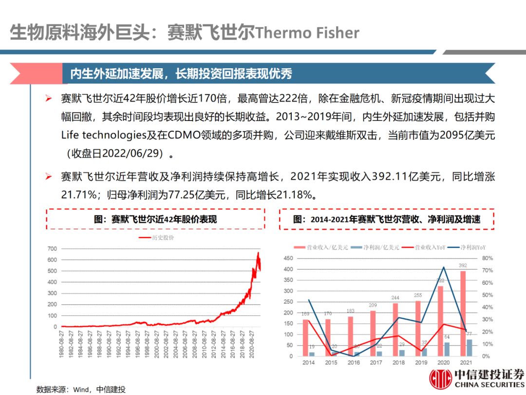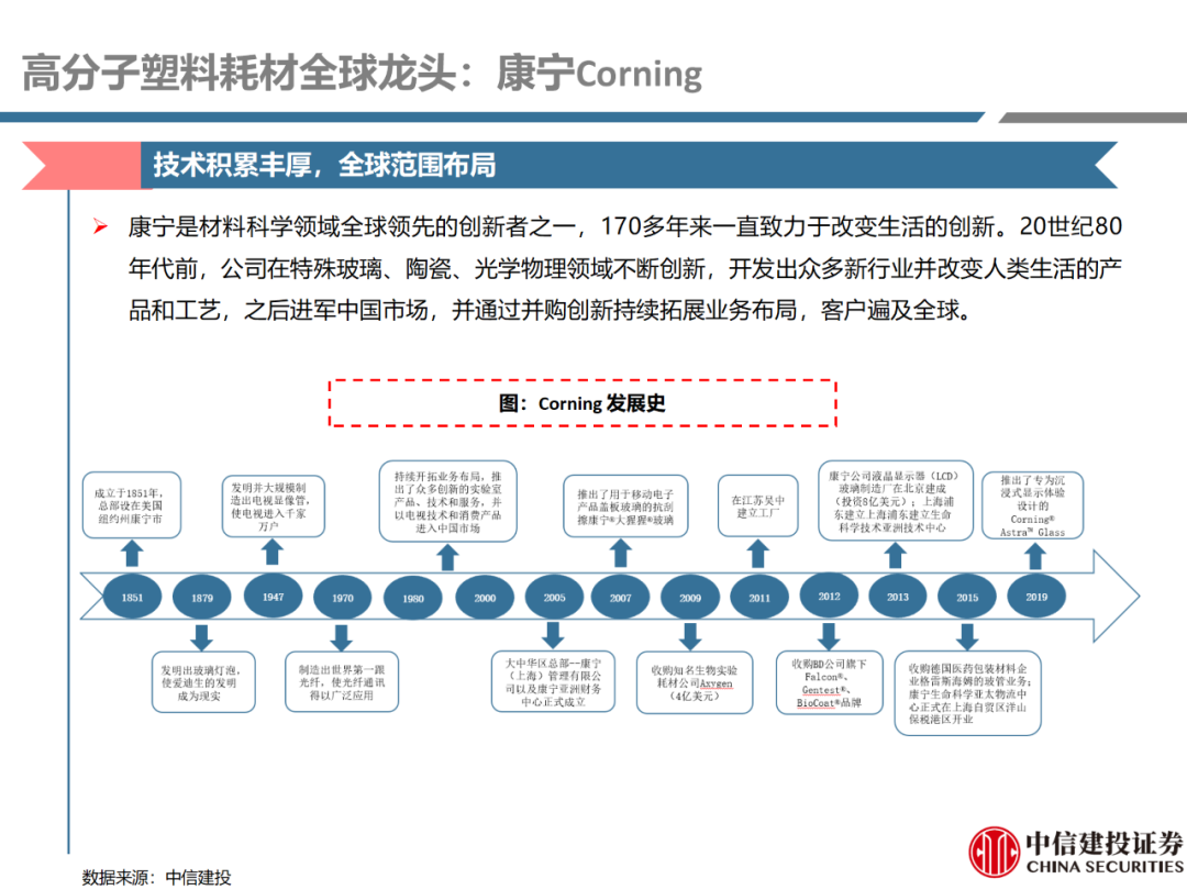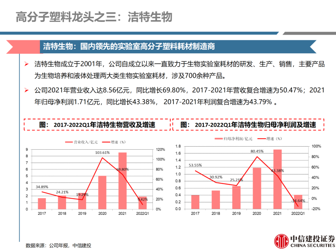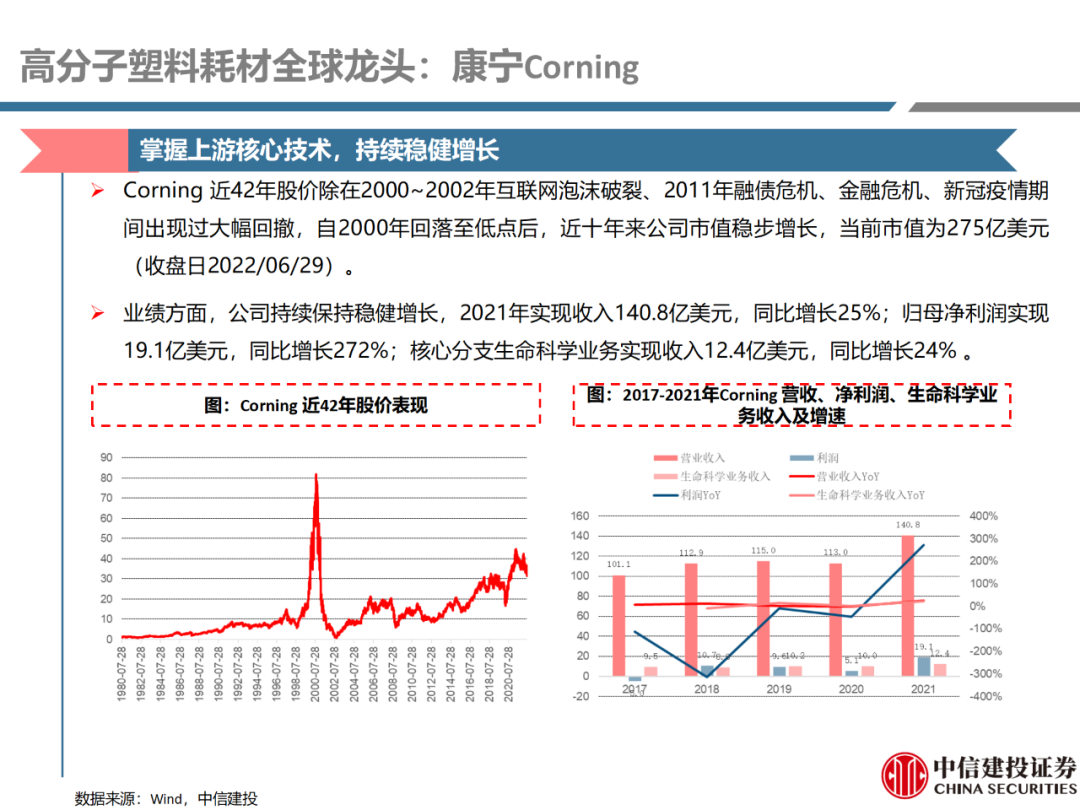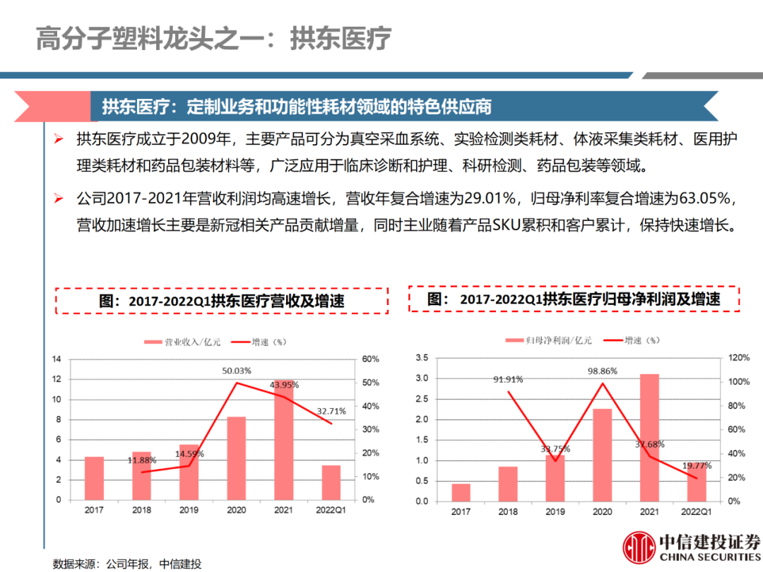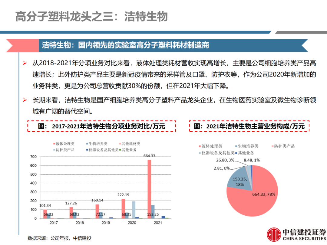 | 体外诊断上游原料需求多样,多因素推动行业高增长。IVD上游原料种类复杂,包括生物原料、塑料制品和支持性材料等。2019年全球体外诊断试剂原料市场规模预计约为303.3亿元,其中中国市场的规模预计约为62.9亿元。全球生物原料龙头赛默飞及高分子塑料龙头康宁凭借多年积累的核心技术及全面的产品布局,业绩持续实现稳健增长并取得可观的股价回报。国产品牌经过多年积累,逐渐掌握核心技术、丰富产品品类,新冠疫情爆发客观上对抗原抗体、分子酶等生物原料及高分子塑料耗材产品带来巨大需求,国内厂家近两年借此加速成长。生物核心原料:技术升级、品质驱动,国产份额快速提升。生物核心原料产品主要包括抗原、抗体、诊断酶等,疫情前takara等进口品牌占有国内80%以上市场份额。国产龙头企业多年来持续研发投入,基因工程技术用于生物原料产品的研发和生产已臻于成熟。新冠核酸、抗原及抗体检测带来上游原料的爆发性增长,国产品牌在取得大额现金流的同时,从“质量+品类+价格+效率+服务”全方位发力,国产品牌竞争力显著提升。高分子塑料耗材:“全球新冠疫情+国内IVD集采”加速供应链的本土化。体外诊断上游原料产品有反应杯、培养皿、纳米微球、NC膜等高端耗材,产品种类复杂,技术难度不一,低端产品国产化程度高,高端产品主要依赖进口。2020年新冠疫情使得全球供应链受阻,物流成本大幅增加,催使全球IVD龙头与国内供应商深度合作;此外IVD试剂集采降价压力下,国内龙头厂家也在寻找性价比更高的国内供应商,进口品牌本土化+IVD集采为国内高分子塑料耗材厂家带来良好的发展机遇。行业相关标的梳理:从“技术平台+产品”的角度,我们建议关注:诺唯赞(以高端酶为特色的生物试剂龙头)、义翘神州(蛋白试剂数量全球领先)、百普赛斯(重点布局重组蛋白)、拱东医疗(以定制业务和功能性耗材为特色)、昌红科技(高分子塑料耗材隐形冠军)、洁特生物(实验室高端耗材供应国内领先)、关注IPO已过会的菲鹏生物(IVD核心原料供应商)及近岸蛋白、康为世纪等。风险提示:新业务拓展不达预期的风险;新冠检测业务下滑过快,行业产能过剩的风险;新进入市场企业快速增加致价格大幅下降的风险;工业客户产品集采致价格下滑进而被动降价的风险。