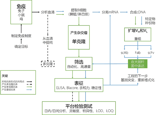 目前批准的许多寄生虫病的测试被认为受到特异性或灵敏度的限制,或对辅助部件和训练有素人员的要求。 特异性的问题正通过严格的方法来解决,以合理的抗体开发来检测特异性抗原。这种具有极高亲和力的抗体的开发会影响到检测的灵敏度。 然而,对灵敏度的最大贡献可能来自于检测平台和组件的改进,这也会影响到对集中式实验室检测的要求,因为在低资源环境下,没有受过训练的人员。 1、抗体 有几个因素会影响任何分析测试的质量。无论何种形式,测试的特异性是最重要的,在免疫测定领域,特异性取决于抗体和目标抗原之间的相互作用。图1中概述了产生特异性抗体的众多途径。 图1 | 抗体产生途径概述。从确定目标生物标志物开始,概述了为诊断性检测开发优越的生物识别元素的关键步骤。 多克隆试剂的使用因其产生的广泛特异性、对大量实验动物的要求和批次间的差异而受到影响。单克隆抗体的产生是产生特异性抗体的一种途径,与多克隆抗体的广泛覆盖面相比,它的灵敏度降低。传统上,由于亲和力上限的概念,这种试剂表现出低纳摩尔的亲和力[1]。 这些限制可以通过重组抗体技术来解决,该技术允许通过一些展示技术开发出亲和力极高的特异性试剂[2]。再加上先进的重制方法,这些重组抗体对诊断应用具有相当重要的意义。预计在不久的将来,基于重组抗体的诊断测试的发展将凸显出来。为了解决交叉反应问题,基于详细目标评估的知识驱动的方法可以最小化,或者如果需要的话最大化目标交叉反应。 使用替代宿主来产生抗体,如鸡,也可以帮助减少由于补体元素和人类抗小鼠抗体(HAMA)交联造成的假阳性[3]。因此,产生的试剂的质量将对所设计的检测方法的灵敏度和特异性产生重大影响。样品基质及其制备与应用的信号检测方法相结合,将对灵敏度产生巨大的影响,表1中概述的几种方法显示了改善传染病检测的复杂方法。 表1 | 正在研究中的用于检测传染病的检测方法 [a] ND,未确定;CV,循环伏安法;DLS,动态光散射法;EID50,50%鸡蛋感染剂量;EIS,电化学阻抗光谱法;EMPAS,电磁压电声学传感器;FO,光纤;LFIA,侧向流动免疫测定法;MAPIA,多抗原打印免疫测定法。MEMS,微机电系统;NALIFA,核酸LIFA;PEMC,压电激发的 mM级悬臂;QCM,石英晶体微天平;RIfS,反射干扰光谱;SPEC,丝网印刷碳电极;TCID50,组织培养感染剂量中值。 2、微流控技术和纳米技术及其与传染病检测的关系 微流控方法是解决目前RDT局限性的有力方法。微流控系统正朝着本质上是「芯片实验室」的平台发展,对低资源环境有潜在的重大好处。这样的系统在一个复杂的通道、混合器和区域网络中整合了检测步骤,在微观尺度上,允许以最少的操作培训和投入来进行测试。 Weigl和同事[4]很好地回顾了微型或非仪器化的微流控设备领域。作者论述了此类设备在泵送、混合和阀控、待测物与基质分离、样品分离、浓缩和检测等方面的主要发展要求。自主地整合众多样品操作步骤的能力对提高RDT的可靠性有好处。每个设备的成本[5]相当重要,特别是在不发达的国家,制造技术正朝着聚合物微加工方向发展,以降低相关成本[6]。 除了这些新颖的微流控设备,多重检测的能力对于评估一种疾病的若干生物标志物或在一次检测中评估多种疾病的若干生物标志物也很有意义。 对于某些疾病,地理位置或病原体漂移可能会给这些设备带来潜在的限制,然而,检查多种病原体的能力、降低成本以及纳入控制、分型和耐药性测试将对低资源环境下的传染病诊断大有好处。 使用纳米结构,如金纳米粒子、超磁纳米粒子和量子点(QDots)作为新的检测方法是有意义的。例如,量子点是很方便的,因为它们只需要一个激发光,并且适合于条形码式的多重检测。 Tang和他的同事展示了一种类似于ELISA的方法,利用纳米粒子灵敏地检测受感染小鼠血清中的炭疽毒素。这种基于Europium纳米颗粒板的免疫测定(ENIA)在单克隆和多克隆抗体的夹心试验中检测出了炭疽PA,其灵敏度比ELISA格式的相同试验高出100倍[7]。 作者展示了纳米技术辅助的炭疽感染快速检测,尽管不是在微流控平台上。Sia和同事展示了纳米技术和微流控技术的融合,他们通过采用非常适合低资源环境的便携式低成本方法,开发了一种新的艾滋病毒诊断方法。该装置使用基于聚二甲基硅氧烷(PDMS)的软光刻技术来生成微流控表面,并将金胶体和银膜的不透明性与简单的半导体激光二极管相结合,用于HIV(gp41)血清诊断[8]。 Klostrancec和他的同事开发了一种条形码类型的方法,用于同时检测乙肝和丙肝以及HIV,该方法在微流控平台上整合了一种多重检测方法[9]。在这种检测中,特定的抗原被涂在QDot上(HBsAg、HCV NSP4和HIV-gp41),并与添加了同源抗体的人血清一起孵化,由抗物种AlexaFluor-488标记的抗体检测。当引入微流体结构时,电动力将QDot夹层输送到激光器,在那里检测荧光信号。所展示的微流控技术和纳米技术的融合实现了大约1小时的测定时间和远高于美国食品和药物管理局批准的同类产品的灵敏度。 Kim和他的同事开发了一种生物条码扩增方法,用于诊断病人血清样本中的HIV-1,使用基于纳米粒子的夹心法,然后是RT-PCR或基于芯片的扫描检测方法[10]。 后一种方法不需要酶促扩增循环步骤,可以在POC中得到潜在的应用,所设计的系统在灵敏度方面优于ELISA,其检测范围为0.1 pg/mL至10ng/mL