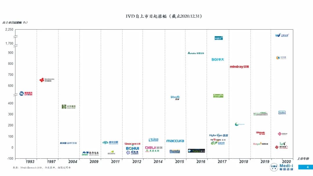 自上市之日起涨幅TOP5:万泰生物、金域医学、安图生物、东方生物、华大基因(红色标记)