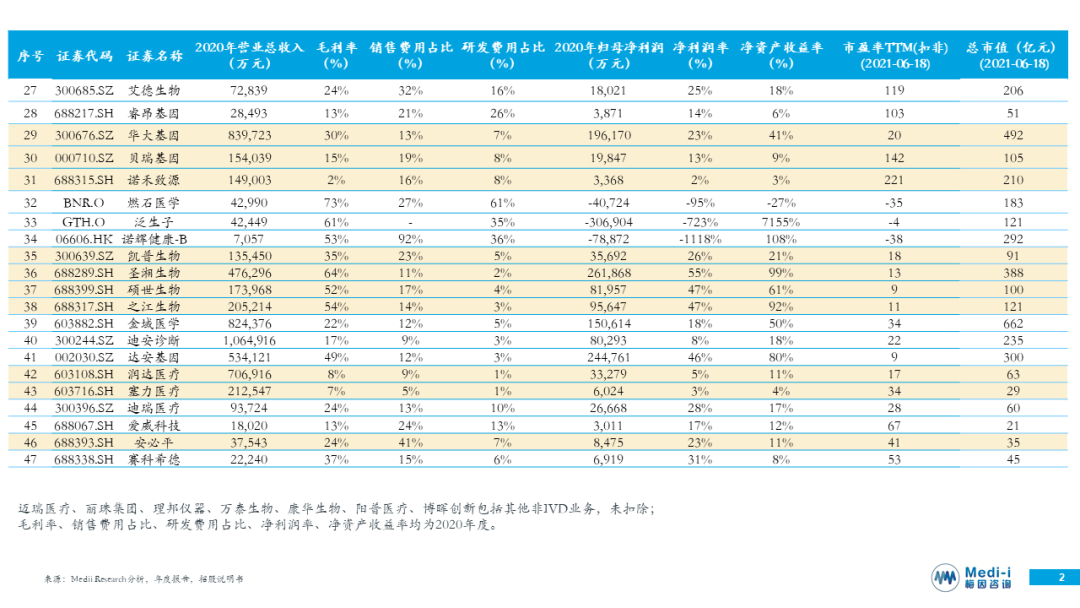27-28 IVD业务以肿瘤伴随诊断检测为主,包括艾德生物、睿昂基因。艾德生物各项指标优于睿昂基因。 29-31 IVD业务以基因测序服务为主,包括华大基因、贝瑞基因、诺禾致源。诺禾致源市值竟然为贝瑞基因的2倍。 32-34 IVD业务以肿瘤早筛为主,包括燃石医学、泛生子、诺辉健康。大抵是临床试验、拓客都很费钱,诺辉健康营收远低于燃石医学和泛生子,但其市值约等于燃石医学与泛生子之和。 35-38 IVD业务以分子诊断为主,包括凯普生物、圣湘生物、硕世生物、之江生物。受益于COVID-19疫情,可持续性存疑。 39-41 第三方诊断实验室,包括金域医学、迪安诊断、达安基因。 42-43 集约化服务提供商,包括润达医疗、赛力医疗。 44-45 IVD业务以尿液诊断为主,包括迪瑞医疗、爱威科技。爱威科技些许高估。 46 IVD业务以病理诊断为主,如安必平。 47 IVD业务以血液诊断为主,如赛科希德。 资料来源:招股说明书、年度报告等 |