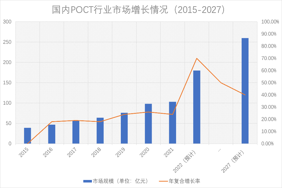 POCT技术最早开始于20世纪中期,Edmonds以干化学纸片检测血糖及尿糖,随后Ames公司将其干化学纸片法检测项目扩大并商业。由于方法简便快速,很快便得到普遍应用。与欧美国家相比,国内POCT行业起步较晚,其概念到2004年才正式引入中国,但随着我国相关学科门类的不断完善,免疫层析、生物传感器等技术的进步,医疗体系建设的不断加强,就医需求增加等,POCT行业在我国也得到了迅猛的发展。从2015年中国POCT第一股上市开始,我国POCT市场规模以每年超过20%的速度快速增长。据前瞻产业研究院发布的《2022年中国即时检测(POCT)行业全景图谱》数据显示,截至2021年底,我国POCT市场规模达到110亿元,预计2027年整体市场规模将超过260亿元,远超全球POCT行业7.4%的发展速度,已成为我国IVD行业增长最快的细分领域之一。随着市场规模不断扩大,越来越多的外资企业将POCT产品线发展对准中国市场。据相关数据显示,我国POCT市场仍由外资企业占据主导地位,约占比60%,主要为“罗、雅、丹、西、希”五大IVD企业。而作为涉及到国计民生的医疗检测行业,在追求行业快速发展的同时,将主动权掌握在自己手中,不断推动POCT国产化发展至关重要。