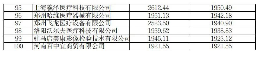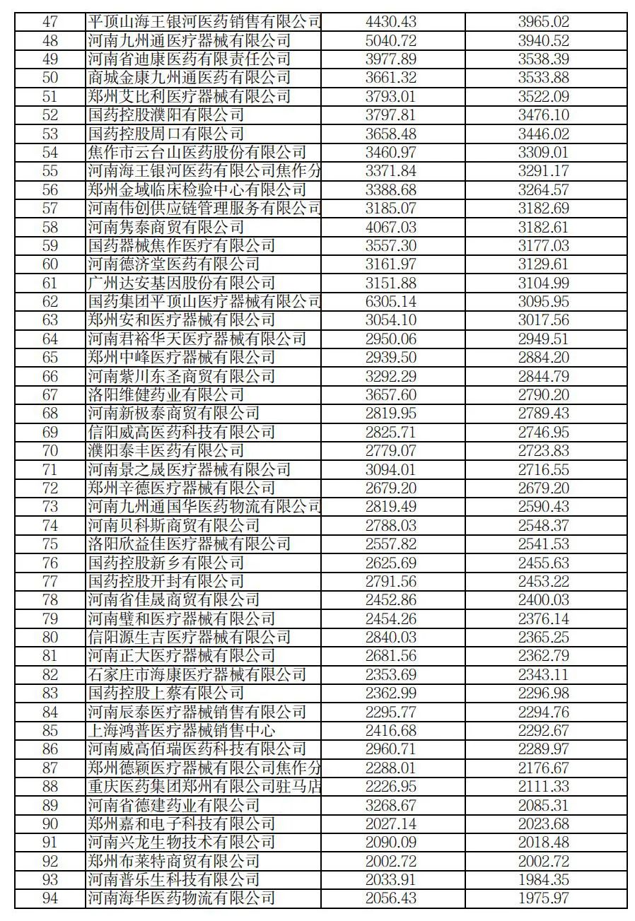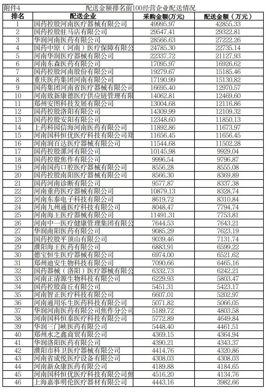 流通领域排名前五的配送商分别是:国药控股河南医疗器械有限公司、国药控股驻马店有限公司、华润河南医药有限公司、国药中原(河南)医疗保障有限公司、河南华润医疗器械有限公司,配送金额分别为4.28亿、2.93亿、2.72亿、2.27亿、2.11亿。