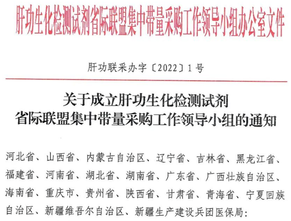 7月27日,一份《关于成立肝功生化检测试剂省际联盟集中带量采购工作领导小组的通知》在业内流传;据悉,该22省市联盟集采工作小组或已初步成立。