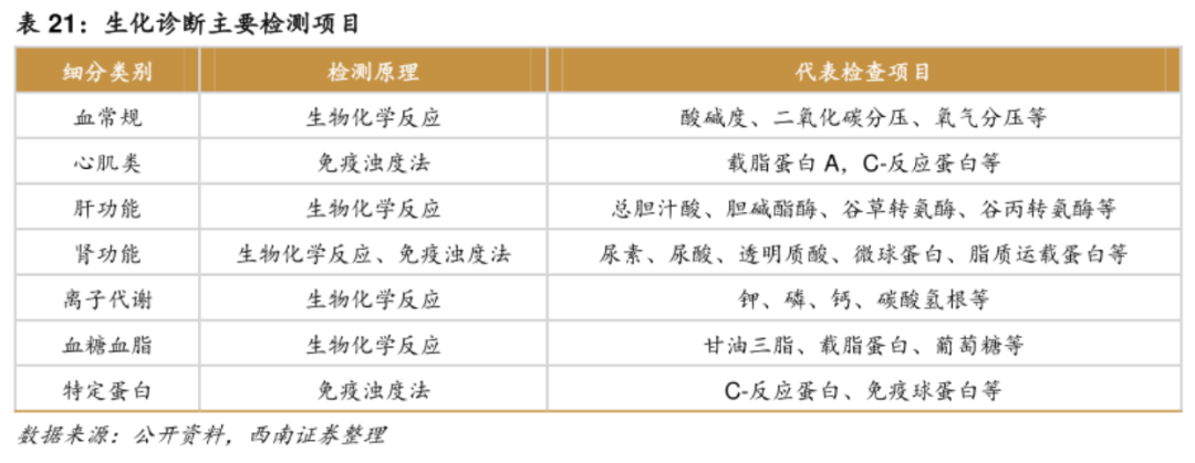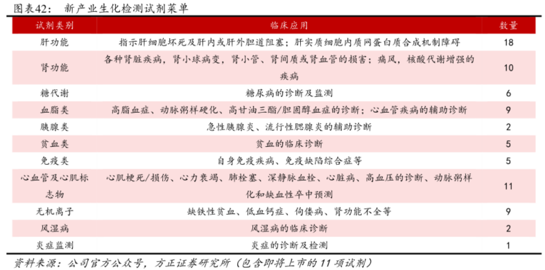 实际上,历经安徽化学发光的试点(打破封闭式“设备+试剂”系统不可能集采的认知),市场对生化检测领域集采早有预期,但超出预期的可能是推进的速度和省际联盟的覆盖范围。 预计本次集采将对国内生化体外诊断市场竞争格局带来较大的洗牌效应。 生化诊断,又称临床生化,常用于血糖、血脂、胆固醇、肝功能、肾功能等基础检查项目。简而言之,就是用检测特定的生化物质含量判断人体是否处于健康状态。IVD的三大主要细分领域中,生化诊断最为成熟,被投资者视为“红海”,约占国内IVD市场规模的19%;由于生化试剂进入门槛低,毛利率高,大多新品牌均以此为切入点进入IVD领域,目前全国约有超过200家相关的注册公司。本次集采的肝功生化试剂,主要包含:白蛋白、总蛋白、总胆红素、直接胆红素、谷丙、谷草、胆碱酯酶、总胆汁酸、5-核苷酸酶、碱性磷酸酶、前白蛋白、腺苷脱氨酶、甘胆酸、单胺氧化酶等多个项目。尽管我们并未查阅到肝功能试剂在生化市场中的具体规模和占有率,但可以从两家IVD头部企业的数据进行侧面估算: ● 2021年公司国内生化试剂收入约9亿元(生化业务国内市占率约为11%),其中肝功占比约20%(营收1.8亿元左右)。● 如下图所示,在新产业生化检测菜单中,共有78个项目,其中肝功能就有18个,占整体项目数的23%左右。2021年中国生化诊断行业市场规模约为92亿元,上述粗略预估肝功能占生化市场规模大约20-25%的区间,对市场规模在18.4-23亿左右,可以算是生化检测最大的细分之一。