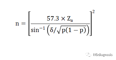 3.这里还有一种方法,是参考目前比较火的新冠抗体检测试剂文献的样本估算的方法。当灵敏度或特异度小于20%或大于80%时,样本率的分布呈偏态,需对符合率的平方根进行反正弦转换,样本量计算公式为: