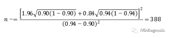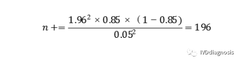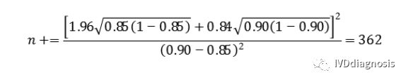 例:某检测试剂的灵敏度预期为85%,特异度预期为90%,临床试验采用试验体外诊断试剂与临床参考标准进行比较研究的方法,评价试验体外诊断试剂的临床性能。允许误差Δ取值0.05,则具有目标疾病状态的受试者(阳性)最低样本量(n+)估计为: