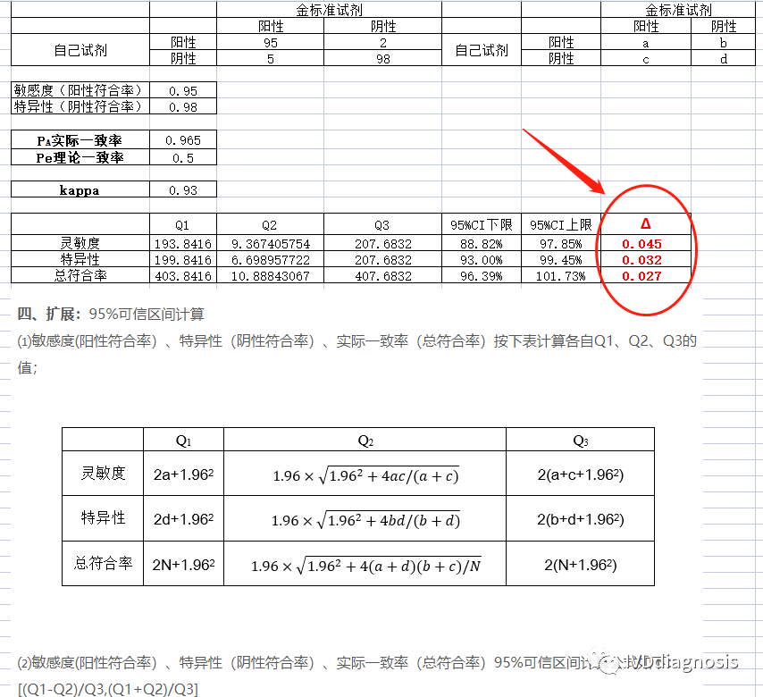 我自己做了一个小程序,可以自动计算kappa检验的置信区间和Δ值,见下图: