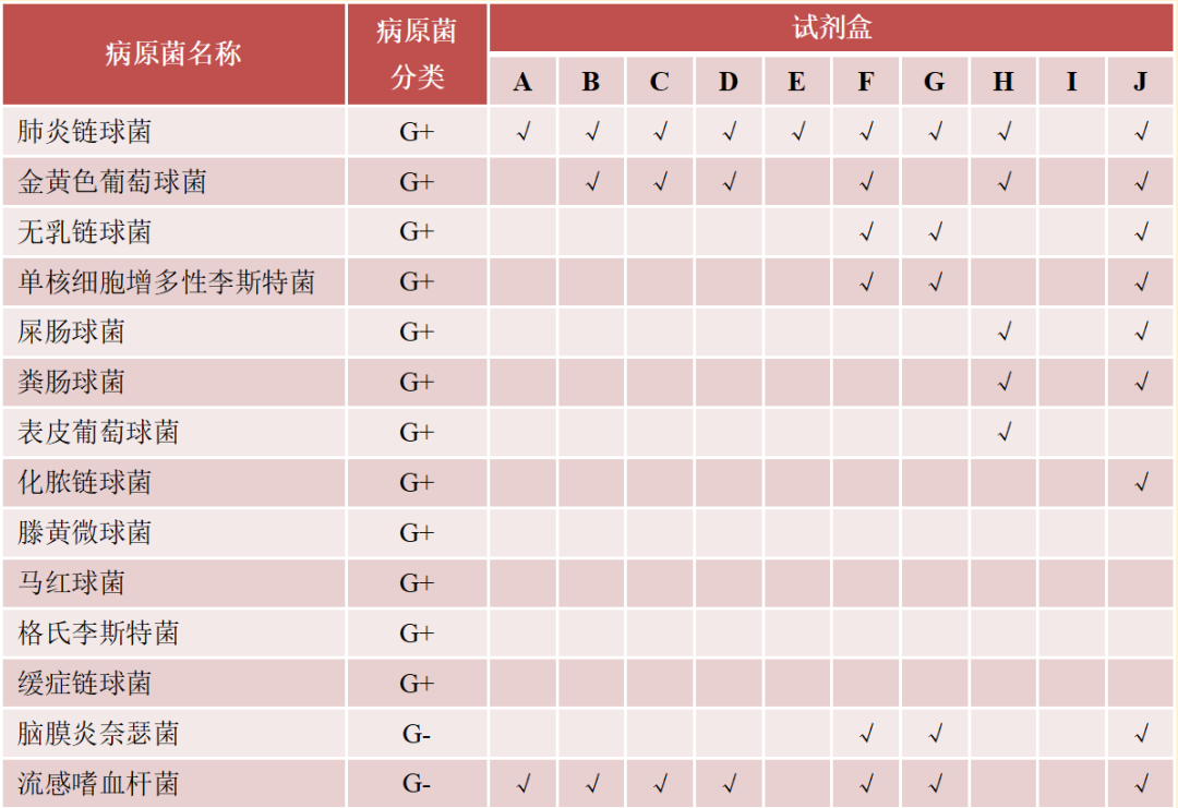 作者:刘东来 周海卫 沈舒 ,通讯作者:许四宏 摘要 目的 了解我国病原菌多重核酸检测试剂盒的分析性能的现状,特别是检出限性能的基本情况,为相关研发企业和医疗机构使用者提供参考。 方法 根据体外诊断试剂行业标准《细菌和真菌感染多重核酸检测试剂盒(标准号YY∕T 1725-2020)》,使用“34种细菌和真菌感染多重核酸检测试剂国家参考品(批号370026-201801)”对10种不同检测技术原理的病原菌多重核酸检测试剂盒的分析性能做了评估,包括阳性符合率、阴性符合率、重复性及检出限等进行质量评价,并按照国家参考品的质量标准对评价结果进行统计分析。 结果 10款试剂盒中包括4款呼吸道感染、3款中枢神经感染及3款血流感染试剂盒,检测范围或病原谱覆盖8种革兰阳性细菌、14种革兰阴性细菌及10种真菌和非典型病原体。各试剂盒的阳性符合率、阴性符合率、重复性及检出限等分析性能均符合国家参考品的质量标准。呼吸道、中枢神经及血流感染类试剂盒病原菌谱及检出限性能差异较大,检出限的中位值分别为5×103 CFU/ml、1×103 CFU/ml及1×106 CFU/ml;各试剂盒病原菌谱中分布和出现频率较高的6种病原菌分别为肺炎链球菌(检出限的中位值为5×102 CFU/ml)、金黄色葡萄球菌(3×103 CFU/ml)、流感嗜血杆菌(1×103 CFU/ml)、铜绿假单胞菌(5×104 CFU/ml)、鲍曼不动杆菌(3×106 CFU/ml)及大肠埃希氏菌(5×104 CFU/ml)。结论 我国已经进入体外诊断试剂注册阶段的病原菌多重核酸检测试剂盒均具有较好的准确性、特异性及重复性;同时,研发企业应注意结合临床具体的需求,设计合理的试剂盒病原菌谱,并持续优化检出限性能。 [关键词] 病原菌;多重核酸检测;参考品;检出限 病原菌引起的呼吸道、中枢神经系统、血流、胃肠道及生殖道等感染性疾病具有发病急、进展快等特点,且临床发病率和病死率较高,对人类健康构成严重威胁。近年新型冠状病毒肺炎(coronavirus disease 2019, COVID-19)疫情发生以来,临床继发性病原菌合并感染更是会严重威胁COVID-19患者的生命[1-2]。迅速地确定感染病原体对于患者的治疗及预后十分关键。尽管目前临床传统的病原菌检测方法仍以培养及表型鉴定为主,分离培养虽然是病原学诊断的“金标准”,但检测周期长、操作繁琐、敏感性低等已无法满足临床诊治的需求。与之相比,分子诊断技术的速度发展,在突发性感染的评估、感染早期的发现、监测及病原菌耐药基因分析等领域发挥了越来越重要的作用[3-7]。 近年来逐渐发展的病原菌多重核酸检测技术,即在一个核酸反应体系中同时对多个靶标病原菌进行检测,更具有操作简便、覆盖病原菌谱广、能够分辨混合感染等优势,正受到越来越多的关注和应用。目前,美国FDA已经批准了10余款病原菌多重核酸检测试剂盒,覆盖PCR、熔解曲线、恒温扩增及微阵列核酸芯片等技术原理;我国药监部门批准了3款试剂盒[8-9]。然而,多重核酸检测技术仍存在一些局限和挑战。例如,多重反应体系研发难度较大、试剂盒特异性和灵敏度可能会低于单一靶向反应体系、试验操作较为繁琐及检测成本较高等;另外,相关试剂盒在检测技术的选择、检测范围或病原谱的设计及检出限性能的优化等方面也面临诸多挑战。因此,为保证病原菌多重核酸检测试剂盒的质量,应特别重视相关产品的质量控制及评价研究[10]。 2018年至今,仅在中国食品药品检定研究院完成注册检验的病原菌多重核酸检测试剂盒就有将近20款,行业爆发式发展的态势已然初现。为全面了解我国相关产品分析性能的基本现状,针对10款进入体外诊断试剂注册阶段的病原菌多重核酸检测试剂盒的部分分析性能,包括阳性符合率、阴性符合率、重复性及检出限性能进行了质量评价研究。 01 材料与方法 1.1 评价方案 评价用体外诊断试剂行业标准《细菌和真菌感染多重核酸检测试剂盒(标准号YY∕T 1725-2020)》由项目组牵头制定并发布,标准基于“34种细菌和真菌感染多重核酸检测试剂国家参考品(批号370026-201801)”,对相关试剂盒的要求、试验方法及标签和使用说明书等内容进行了规定[10-12]。 上述评价用国家参考品由项目组研制并提供,参考品由34种具有特定浓度(CFU/ml)的病原菌组成,包括12株革兰阳性细菌(肺炎链球菌、金黄色葡萄球菌、无乳链球菌、单核细胞增多性李斯特菌、屎肠球菌、粪肠球菌、表皮葡萄球菌、化脓链球菌、滕黄微球菌、马红球菌、格氏李斯特菌、缓症链球菌)、16株革兰阴性细菌(脑膜炎奈瑟菌、感嗜血杆菌、嗜肺军团菌、肺炎克雷伯菌、铜绿假单胞菌、鲍曼不动杆菌、大肠埃希氏菌、产酸克雷伯菌、阴沟肠杆菌、奇异变形杆菌、粘质沙雷氏菌、干燥奈瑟氏菌、荧光假单胞菌、嗜水气单胞菌、琼氏不动杆菌、副流感嗜血杆菌)及6株念珠菌(热带念珠菌、光滑念珠菌、白色念珠菌、近平滑念珠菌、克柔念珠菌、葡萄牙念珠菌)[10]。 1.2 病原菌多重核酸检测试剂盒 进行分析性能质量评价研究的10款病原菌多重核酸检测试剂盒由7家企业(广州万孚生物技术股份有限公司、苏州创澜生物科技有限公司、华大生物科技(武汉)有限公司、梅里埃诊断产品(上海)有限公司、湖南圣湘生物科技有限公司、百康芯(天津)生物科技有限公司、上海捷诺生物科技有限公司)提供,见表1。 表1 病原菌多重核酸检测试剂盒▾ 注:*. 试剂盒A、E、F和G同时检测病原菌和病毒;PO