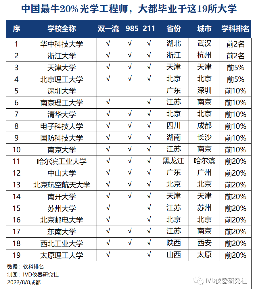 中国哪些高校盛产工程师? 中国哪些高校的机械专业最好? 中国IVD行业的工程师们来自哪些大学? 《中国IVD仪器工程师母校盘点》正式开启! 在上篇中,最牛的20%机械工程师,来自45所大学。而到了光学,则仅有19所。人才来源,足足少了2.5倍。这也是,为何一名好的光学工程师,如此难招的根本原因。生源量就少了。 另外,IVD仪器,以及其他医疗影像设备,像腹腔镜、眼科验光设备等,我没记错的话,需要成像光学技术偏多。我在2021年,为一家眼科设备公司,招聘光学工程师,点名要成像技术方向。还要会zemax、lightloos软件,还有光学器件选型之类。为此,我还学习了部分光学原理,像是回到大学物理课。找了一个月,但依然没找到。当时我已濒临崩溃。 有跟一些光学朋友聊,说由部分毕业后,就不再从事光学系统设计;有部分进入事业单位,像长春光机所、西安光机所、上海光机所等,不愿到企业来;也有部分,进入了造车企业,从事照明光学系统设计;还有一些,则是到了半导体、通信行业,从事激光、光通信领域设计。反正,搞成像的,就是特少! 从下表可以看到,有1个学校,是挺牛的。那就是深圳大学,是唯一一所,非双一流、非985/211的大学,专业实力进入前10%。但是,在人才市场上,较少碰到深大的同学。不够,深大的张教授,创办了一家很牛的IVD仪器公司,深圳活水。深大的光学同学,对钻研IVD仪器感兴趣,不妨考虑近水楼台。 — END — |