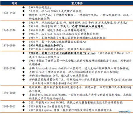 图1:美敦力发展历程中的主要事件 迈瑞医疗最初以代理国外医疗设备起家,1993 年第一款自主研发的产品为多参数病人监护仪。到目前,迈瑞医疗已发展成为国内医疗器械的龙头公司。2008年迈瑞收购美国Datascope生命信息监护业务;2011年控股了深圳深科医疗、苏州惠生科技、浙江格林蓝德、长沙天地人四家公司;2012年收购上海医光仪器有限公司;同年,迈瑞收购了德骼拜公司,进入骨科业务领域;2013年收购了高端美国超声企业ZONARE公司。一系列的并购之路,使迈瑞完成了从跟随者到领先者的转变。 从美敦力和迈瑞医疗发展史中我们可以看到,在公司发展初期,创新和集中度的提升扮演重要的角色。公司发展到一定阶段之后,通过并购实现外延式的产品延伸则是重中之重。 |