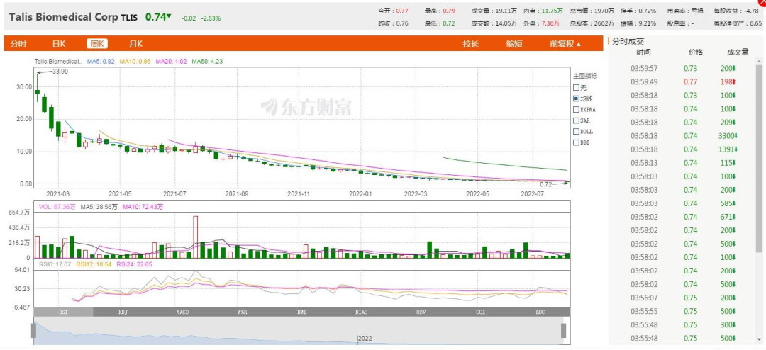 近日,器械之家获悉,即时感染检测开发商Talis Biomedical 宣布将停止其即时 COVID 测试的工作,转而重新专注于女性和性传播疾病检测。另外,该公司还表示将再裁员 35%,预计将在今年第四季度完成。 据了解,Talis Biomedical于2021年2月12日正式登陆美国纳斯达克市场,公司在6个月前就已经裁员25% ,当时该公司表示,由于大规模制造的挑战,它无法为其 Talis One 系统推出新型冠状病毒测试,并且正在对其工艺和产品设计进行全面审查。这些麻烦在今年仍然存在;不过该诊断产品已于 2021 年 11 月获得 FDA 的紧急授权。 Talis 由 Brian Coe 和 Rustem F. Ismagilov 博士于2010 年 3 月创立;成立之初公司原名为 SlipChip,是一家即时感染检测开发商 。旨在通过开发创新产品并将其商业化来提高诊断测试精准度,这些产品旨在对传染病和其他疾病进行准确、可靠、低成本和快速的分子检测。2018年SlipChip 将公司名称更改为 Talis Biomedical 并在加利福尼亚州门洛帕克设立总部。 公司主要产品Talis One平台,是一个从样本到结果、支持云分子诊断的平台,一旦获得授权,可以快速部署到美国和世界各地的分散式诊断环境中,以在床旁诊断传染病。该系统将稳健的样品制备与高度优化和快速的等温核酸扩增技术相结合,能够快速检测各种未净化患者样本类型的传染性病原体;其是一个集成平台,包括紧凑型仪器、一次使用测试盒和含纳中央云数据库的软件。 上市后股价暴跌 2021年2月,Talis Biomedical公司以2.54亿美元的价格上市,在纳斯达克首次亮相时每股价格为16美元,历史最高价格为33.9美元/股,对应市值约9亿美元(折合人民币60.85亿元),是2021年美股医疗科技第10大IPO企业。而目前该公司最新股价为0.74美元/股,市值1970万美元(折合人民币1.33亿元)。 然而在完成纳斯达克 IPO 并获得约 2.325 亿美元的净收益后不到一个月,Talis Biomedical 宣布将撤回其向 FDA 申请对其 Talis One COVID-19的紧急授权测试。 2021 年 3 月,该公司表示,该机构无法确保 Talis One 的主要研究中使用的比较诊断足够敏感以证明产品的准确性。 在收回其申请后——该申请将涵盖基于试剂盒的分子测试在某些中等复杂性 CLIA 实验室中的使用——Talis 表示将转而专注于未来提交的针对 CLIA 豁免设置的申请,其中包括在家和其他方面护理测试。 这将意味着使用不同的比较分析进行新的临床验证研究。该试验和随后向 FDA 提交的测试于 2021 年 7 月完成,并于 2021 年11 月初获得紧急授权。 两换CEO 然而,在此期间,Talis Biomedical 宣布其总裁兼首席执行官布莱恩·科 (Brian Coe) 离职,后者于 8 月卸任顾问一职。在 2019 年被 Exact Sciences 以 28 亿美元收购之前,他被 Genomic Health 前总裁、首席执行官兼主席 Kim Popovits 取代。 经过两个月的搜索,Talis Biomedical 找到了一位新的领导者,即前雅培诊断执行副总裁 Brian Blaser,他在体外测试领域拥有超过 25 年的经验。但该公司表示,布拉泽的任期将持续约三周——他因个人原因于 2021 年 12 月上旬卸任。公司首席商务官 Rob Kelley 被提升为 CEO,立即生效。 Rob Kelley 自 2021 年 12 月起担任公司首席执行官。于 2020 年 9 月加入Talis 担任首席商务官;在加入Talis 之前,Kelley 曾担任 Genalyte, Inc. 副总裁, Genalyte, Inc. 负责产品销售和商业开发,这是一家医疗保健分析和即时诊断公司。除此之外,Kelley 还曾在 Illumina 担任过多个职责,包括下一代测序临床应用的全球销售经理和市场总监。 Talis Biomedical 作为是众多参与新冠检测械企的其中之一,其所开发的TALIS ONE™ COVID-19测试系统,从样本到结果不到 30 分钟即可完成中央实验室质量的 SARS-CoV-2 分子检测,该系统于2021 年 11 月获得 FDA 的紧急授权。