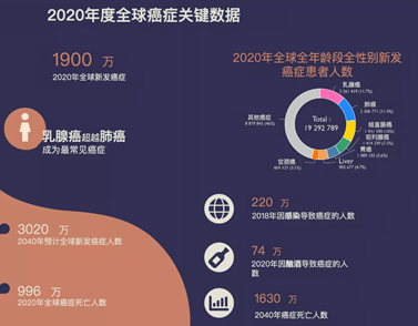 癌症严重威胁人类生命健康,2022年1月6日,世界卫生组织(WHO)下属的国际癌症研究机构(IARC,International Agency for Research on Cancer)发布了《IARC Biennial Report 2020-2021(双年度报告2020-2021)》;WHO在2020年也发布了《World Cancer Report 2020(全球癌症报告2020)》;GLOBOCAN 2020于2020年12月发布,估计了全球185个国家/地区的36种癌症发病率、死亡率以及癌症发展趋势等相关数据。根据IARC的最新评估显示,2020年全球新发癌症病例1929万,其中男性1006万例,女性923万例;2020年全球癌症死亡病例996万例,其中男性553万例,女性443万例。在本世纪,癌症预计将超过心血管疾病,成为大多数国家过早死亡的主要原因。IARC调查数据中令人震惊的是乳腺癌首次超过肺癌成为全球最常被诊断出的癌症类型。一、全球癌症发病概况
