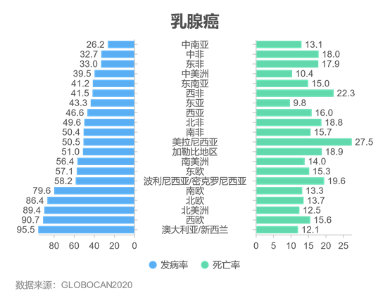 全球主要常见的癌症包括乳腺癌、肺癌、结直肠癌、前列腺癌、胃癌和肝癌,约占全部癌症合计的50.7%。乳腺癌首次超过肺癌成为全球发病率最高的癌症,估计有230万新病例,占比11.7%,乳腺癌是全球第五大致死癌症,有68.5万新增死亡病例。在所有女性癌症患者中,由乳腺癌导至的新发病例占1/4,由乳腺癌导至的死亡病例占1/6。全球185个国家中有159个国家的乳腺癌发病率为第1位,有110个国家乳腺癌死亡率为第一位。全球乳腺癌发病率最高的地区为澳大利亚/新西兰(95.5/10万),发病率最低的地区是中南亚(26.2/10万);全球乳腺癌死亡率最高的地区为美拉尼西亚(27.5/10万),死亡率最低的地区为东亚(9.8/10万)。 图5 2020年不同地区乳腺癌发病和死亡情况(1/10万)