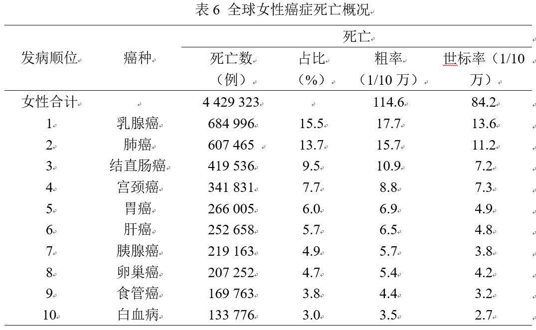 2020年,全球女性新发癌症患者估计有9 227 484例,占总数的48%,其中新发乳腺癌226万例,最为常见,远超女性其他癌症类型。全球女性新发病例数前十的癌症分别是:乳腺癌226万(24.5%),结直肠癌87万(9.4%),肺癌77万(8.4%),宫颈癌60万(6.5%),甲状腺癌45万(4.9%),子宫体癌42万(4.5%),胃癌37万(4.0%),卵巢癌31万(3.4%),肝癌27万(3.0%),非霍奇金淋巴瘤24万(2.6%),这十种癌症占女性新发癌症数的71%。六、全球女性癌症死亡概况