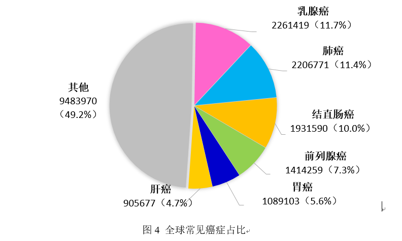 2020年,全球估计新发病例19 292 789例。女性乳腺癌首次超过肺癌成为最常见的癌症,2020年新发乳腺癌2 261 419例,占总体癌症发病的11.7%。全球新发病例数前十的癌症分别是:乳腺癌226万(11.7%)、肺癌220万(11.4%)、结直肠癌193万(10.0%)、前列腺癌141万(7.3%)、胃癌109万(5.6%)、肝癌91万(4.7%)、宫颈癌60万(3.1%)、食管癌60万(3.1%)、甲状腺癌59万(3.0%)和膀胱癌57万(3.0%)。2020年,全球估计9 958 133例癌症患者死亡,肺癌仍是导至癌症死亡的首要原因,估计有1 796 144人死于肺癌,占总体癌症死亡的18.0%。全球死亡病例数前十的癌症分别是:肺癌180万(18.0%)、结直肠癌94万(9.4%)、肝癌83万(8.3%)、胃癌77万(7.7%)、乳腺癌69万(6.9%)、食管癌55万(5.5%)、胰腺癌47万(4.7%)、前列腺癌38万(3.8%)、宫颈癌34万(3.4%)、白血病31万(3.1%)。前10位癌症类型的死亡例数占全部癌症死亡的70%以上。三、全球男性癌症发病概况