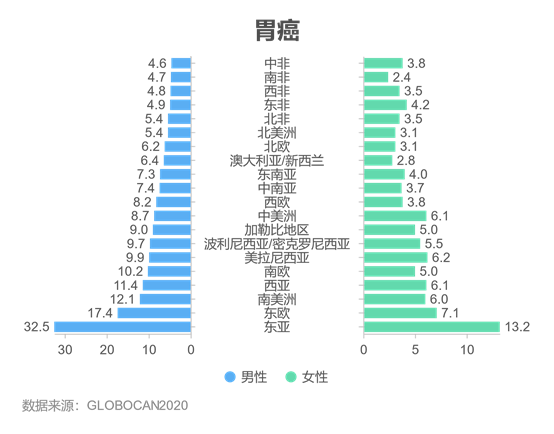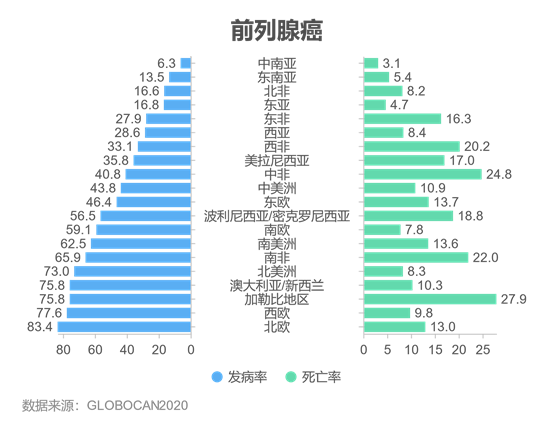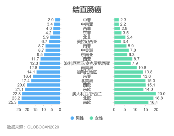 2020年,全球估计新增肺癌患者220万例(11.4%),由肺癌导至的死亡的癌症患者估计有180万例(18.0%),肺癌是全球第二大最常被诊断的癌症类型,也是全球第一大致死癌症。男性发病率和死亡率几乎均是女性的2倍。在男性中,肺癌是全球36个国家最常见的癌症,但却是93个国家首要的癌症致死原因,全球肺癌发病率最高的地区为波利尼西亚/密克罗尼西亚(51.6/10万),发病率最低的地区是西非(2.8/10万)。在女性中,肺癌是全球25个国家首要的癌症致死原因,全球肺癌发病率最高的地区为北美洲(30.1/10万),发病率最低的地区为中非/西非(1.8/10万)。图6 2020年不同地区肺癌发病情况(1/10万)结直肠癌是全球第三大常见癌症,2020年共确诊结直肠癌患者超190万例,大约93.5万人死于结直肠癌,是全球第二大致死癌症。全球范围内,结直肠癌发病率差异较大,发病率较高的地区是欧洲和澳大利亚/新西兰,非洲和中南亚的大部分地区结直肠癌的发病率均较低,最高地区的结直肠癌发病率是最低地区的9倍。图7 2020年不同地区结直肠癌发病情况(1/10万)2020年,全球前列腺癌新发病例约140万例,死亡约37.5万例,是全球第4大常见癌症和男性第2大常见癌症,占男性癌症死亡的第5位。前列腺癌是112个国家的男性中最常被诊断出的癌症,北欧(83.4/10万)、西欧(77.6/10万)、前列腺癌发病率较高。而在亚洲地区前列腺癌较不常见(发病率< 20.0/10万)。图8 2020年不同地区前列腺癌发病和死亡情况(1/10万)胃癌仍是世界范围内的一种重要的癌症,2020年有超过100万新发病例,大约有76.9万人死于胃癌,是全球第五大常见癌症和第四大致死癌症,男性中癌症的发病率约是女性的2倍。男性中,东亚(32.5/10万)、东欧(17.4/10万)和南美洲(12.1/10万)的胃癌发病率较高。在女性中,胃癌发病率最高的地区为东亚(13.2/10万),非洲地区胃癌发病率较低。图9 2020年不同地区胃癌发病情况(1/10万)肝癌是全球第六大最常见癌症和第三大癌症死亡原因,2020年约有90.6万新增肝癌病例,约有83.0万人死于肝癌,在全球大部分地区,男性肝癌的发病率和死亡率均为女性的约2~3倍。在男性中,东亚肝癌发病率最高(26.9/10万),其次是东南亚(21.2/10万)和北非(20.2/10万),中南亚男性肝癌发病率最低(4.0/10万)。在女性中北非地区的肝癌发病率最高(10.5/10万),其次是美拉尼西亚(9.0/10万)和东亚(8.9/10万),中南亚女性肝癌发病率最低(2.0/10万)。图10 2020年不同地区肝癌发病情况(1/10万)综上,全球癌症负担差异显著,但各国癌症防控形势均较为严峻。癌症的多样性提升了全球加强控制该疾病努力的必要性,各国将癌症的预防和治疗纳入到国家卫生计划中,着重强调癌症筛查的重要性和提高癌症的治疗质量,可有助于减少未来世界范围内的癌症负担和痛苦,缩小各国癌症负担差距,逐步、稳健地降低全球癌症整体负担。