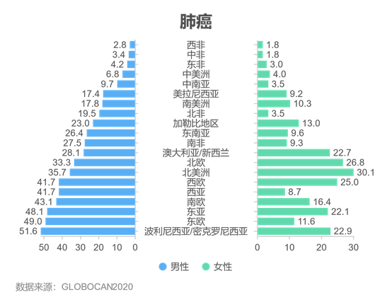 2020年,全球女性癌症死亡4 429 323例,占总数的44%,以乳腺癌、肺癌和结直肠癌最为常见。2020年全球女性癌症死亡人数前十的癌症分别是:乳腺癌68万(15.5%),肺癌61万(13.7%),结直肠癌42万(9.5%),宫颈癌34万(7.7%),胃癌27万(6.0%),肝癌25万(5.7%),胰腺癌22万(4.9%),卵巢癌21万(4.7%),食管癌17万(3.8%),白血病13万(3.0%),这十种癌症占女性癌症死亡总数的近74%。七、不同地区癌症发病率和死亡率
