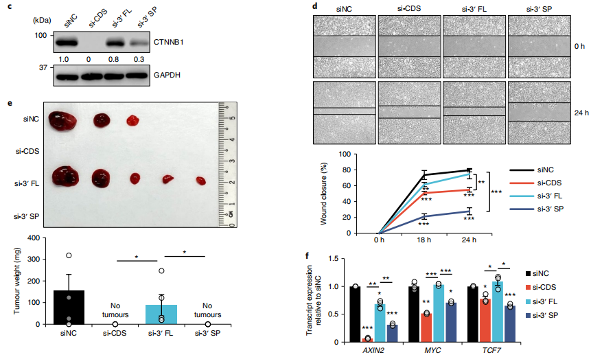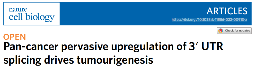 信使RNA(mRNA)包括蛋白质编码区,两侧为5′和3′非翻译区(UTR),在转录后调节中起重要作用。UTR包含许多调控序列和结构,例如AU富含元件、G富含元件和microRNA响应元件,RNA结合蛋白(RBP)和microRNAs通过这些元件调节mRNA代谢。这包括mRNA定位、稳定性和输出等过程,这些过程受到严格控制,以确保在生理条件下正确的基因表达和功能。 大多数哺乳动物基因通过各种机制产生可变3′UTR,包括可变多聚腺苷酸化(APA)和可变剪接。除了关键的生理功能外,对各种疾病状态下3′UTR突变和其他结构变异的频繁观察表明,3′UTR可能在发病机制中发挥关键作用。例如,破坏PD-L1的3′UTR的结构导至其过度表达和抗肿瘤免疫逃避。在癌症中,对可变3′UTR的研究几乎完全集中于APA衍生的较短3′UTR。重要的是,研究表明,APA导至的3′UTR缩短破坏了microRNA结合和相关的竞争性内源性RNA网络,其中转录物竞争共享的microRNA,导至癌症中关键癌基因和肿瘤抑制因子的异常表达。此外,这些缩短的3′UTR可以差异调节蛋白质功能、定位和蛋白质-蛋白质相互作用,从而赋予癌细胞致癌优势。 超过95%的人类基因经历可变剪接以显著增加转录组和蛋白质组的多样性。最近的大规模转录组学分析显示癌症中存在高频率的异常剪接。尽管数据库中对3′UTR剪接事件(3USPs)进行了注释,但迄今为止,只有少数剪接事件被表征,因为绝大多数剪接研究集中在mRNA的蛋白质编码区。 近日,来自世界各地包括新加坡、沙特阿拉伯、马来西亚、泰国、美国、加拿大等地的研究团队在杂志Nature cell biology上发表了一篇题为“Pan-cancer pervasive upregulation of 3′ UTR splicing drives tumourigenesis”的学术文章。在文章中,发现3′UTR剪接广泛存在,在癌症中上调,与不良预后相关,在癌基因中更为普遍。同时还证明了关键癌基因CTNNB1的剪接3′UTR的生理、功能和临床相关性。研究团队验证了其在肝细胞癌和结肠癌中的上调,并表明剪接的3′UTR变体是其致癌功能的主要贡献者。总之,这项研究强调了3′UTR剪接在癌症中的重要性,并可能为基于RNA的抗癌治疗开辟新途径。 图片来源:Nature cell biology 主要 内容 一 3′UTR剪接广泛存在 使用特异性位于3′UTR内的剪接连接点,研究团队从癌症基因组图谱(TCGA)的十种癌症类型和的相应组织(GTEx)中鉴定并量化了7917个RNA测序(RNA-seq)样本中的3USP。总的来说,从TCGA肿瘤及其邻近的正常样本(TCGA肿瘤和TCGA正常)中鉴定出45815和18253个3USP,而在GTEx的健康组织中鉴定出68668个事件。 对于每种癌症和组织类型,研究团队将常见的3USPs(c3USPs)定义为在超过一半的样本中检测到的事件。与3USP相比,不同数据集、癌症和组织类型中确定的c3USP总数更加一致。此外,C3USP在TCGA和GTEx数据之间具有高度可重复性,大多数在不同癌症和组织中普遍检测到。经分析,对比GENCODE注释和已发布的TCGASpliceSeq,其中约20%的C3USP是未注释的,且它们可能具有生物学功能。 转录组分析揭示了广泛的3′UTR剪接。图片来源:Nature cell biology 二 3′UTR剪接在癌症中上调。 为了确定在癌症中失调的3′UTR剪接,研究团队比较了肿瘤中每个c3USP的剪接水平(SPL)与每个TCGA癌症相邻正常样本和相应GTEx正常组织中的值。总共,1490例c3USP中有671例在至少一种癌症类型中显示出显著差异。所分析的十种癌症类型中有八种的c3USP上调比下调更显著。 接下来,研究了每种c3USP的SPL与每种实体瘤类型的总患者生存率(OS)之间的相关性。根据临床结果定义了两种与预后相关的c3USP:不利事件和有利事件,分别为SPL越高,OS越差和越好。不利事件和有利事件的比率在不同癌症类型中有所不同。研究团队将它们与不同癌症中显著失调的c3USP重叠,发现上调的c3USP明显更不利, 其中90个被确定为不利的预后标志物。总之,这些结果表明3′UTR剪接在癌症中优先上调,并可能与癌症结局相关。 3′UTR剪接在癌症中上调。图片来源:Nature cell biology 三 靶向抑制3′UTR剪接可阻止肝癌发生。 在所研究的十种癌症类型中,TCGA-LIHC (TCGA-liver HCC) 样本的3USP数量显著高于其相邻的正常样本。大量3USP与较差的OS显著相关。在31个显著上调事件中,研究团队选择了未注释为NMD靶标的前5名候选靶标(CTNNB1、CHEK1、MAPK1、THUMPD1和WDR55)用于进一步的实验验证。 研究团队设计了反义寡核苷酸(ASOs)来阻断3′UTR剪接位点。这些ASO显著降低了各自的3′SP表达,同时增加了CHEK1、CTNNB1和THUMPD1的未切片全长转录本(3′FL)。这些效应伴随着相应蛋白表达的降低和肿瘤生长的抑制,可能是由于细胞周期抑制,如细胞周期基因(包括CCNE1、CDK2、CDK4和CDK6)表达下调所示。因此,这些ASO可以特异性地抑制3′UTR剪接,这可能在调节癌基因的蛋白表达和致瘤功能中起重要作用。 靶向抑制3′UTR剪接可阻止肝癌的发生。图片来源:Nature cell biology 四 四、CTNNB1的3′UTR剪接促进肿瘤发生。 研究团队进一步检查了HCC中最普遍失调的c3USP,CTNNB1 3′SP,发现cTNNB3′UTR的过度剪接与较差的OS显著相关。与其在患者体内的表达一致,在HCC细胞系Hep3B和SNU398中,CTNNB1 3′SP上调。 为了研究CTNNB1 3′UTR剪接的功能效应,研究团队使用siRNA,专门针对CDS、3′FL的内含子和3′SP的独特剪接连接点。结果显示,与3′FL敲低相比,3′SP缺失显著降低了CTNNB1 CDS转录本和蛋白表达,表明CTNNB1蛋白主要由3′SP转录本表达。也同样观察到si-CDS和si-3′SP介导的细胞生长和迁移减少,以及小鼠异种