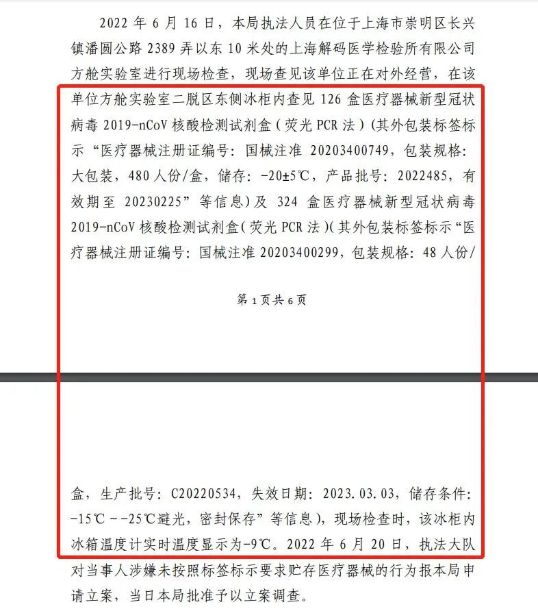 处罚事由显示,执法人员在该公司方舱实验室冰柜内查见126盒医疗器械新型冠状病毒2019-nCoV核酸检测试剂盒(储存:-20±5℃)及324盒医疗器械新型冠状病毒2019-nCoV核酸检测试剂盒(储存:-15℃~-25℃避光),现场检查时,该冰柜内温度计实时温度显示为-9℃。