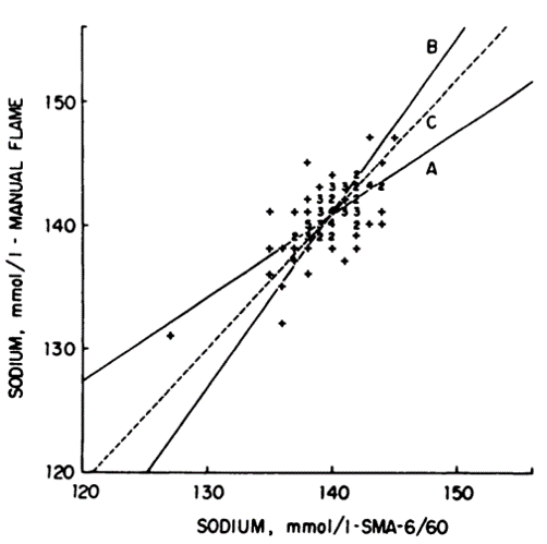 相反,模式Ⅱ没有区分自变量和因变量。例如,要说明血浆甘油三酯和葡萄糖浓度的关系。统计不能用于确定甘油三酯会影响葡萄糖,或反之;最好的解释是第三变量对这两个分析物的浓度有着等同的影响。若需要将新的实验方法和已建立的方法进行比较,以确定它们是否能得到相同的结果,这个问题将有模式Ⅱ处理。