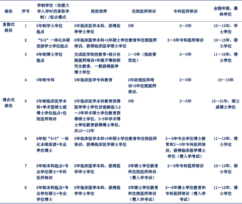 他曾用一张表总结了医学生培养的4种 “直接式路径”,包括3年制专科、5年制本科、“5+3” 一体化硕士、8年一贯制博士,和4种 “混合式路径”[1] 但即便如此也没有穷尽所有。