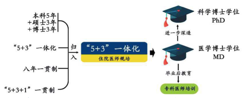 他建议,将目前培养医学博士的四种路径统一化为 “5+3” 一体化的模式(期间已经完成住院医师规培),取得医学博士学位后,就可以做全科医生,如果下一步对科研感兴趣,可以继续深造拿科学博士学位(PhD),或者进行3到5年的专科医师培训,成为专科医师。