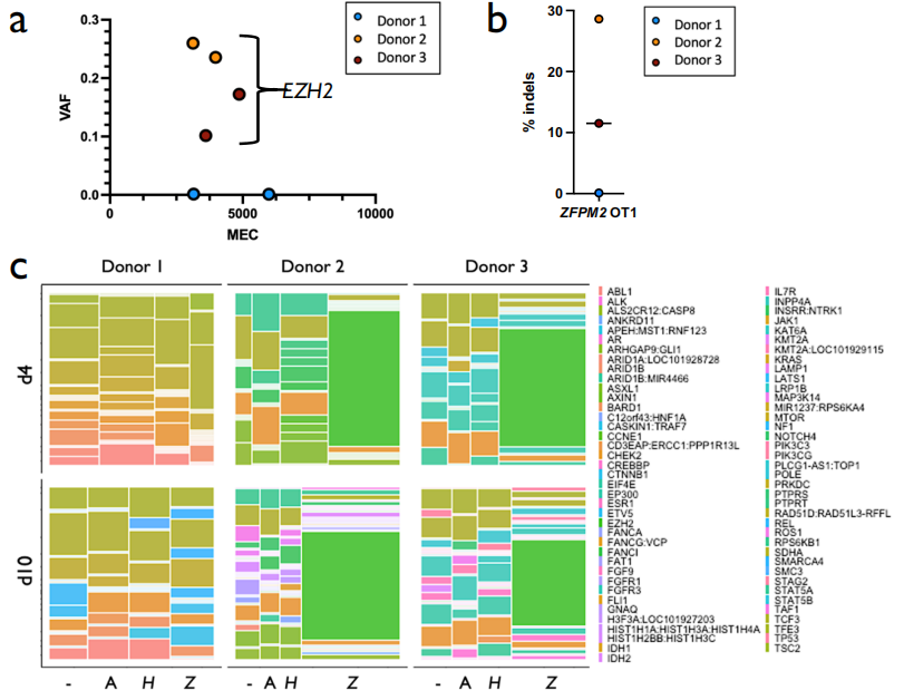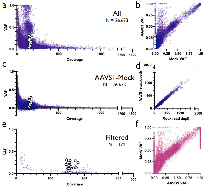 CRISPR系统由一个CRISPR/Cas蛋白与一个向导RNA(gRNA)组成,为了确保用于基因组编辑的CRISPR系统的临床安全,插入和缺失(INDEL)应仅发生在预期的基因组位点,而不会通过非同源末端连接(NHEJ)或同源定向修复(HDR)途径产生脱靶效应。低保真度Cas酶或当gRNA导向与目标序列类似的序列时,可能会发生非预期的基因组编辑,导至可能具有致癌或其他有害后果的非目标突变。检测基因组编辑方法的遗传毒性仍然是安全临床实施的基础。 基因组编辑/基因治疗在临床上的长期安全性的重要性最近得到了说明,在两个镰状细胞疾病基因治疗试验(NCT02140554和NCT04293185)中,两名患者因细胞毒化疗或慢病毒载体的插入突变而发展为髓系恶性肿瘤后导至临床试验暂停。由于这些安全性问题,在本研究中,研究团队试图确定Cas9编辑和/或体外扩增过程中是否引入了致癌变体。理想的方法必须进行超深测序,因为变异等位基因频率(VAF)低于1%的突变仍然无法被大多数全基因组脱靶检测技术检测到。能够检测SNV以及INDEL、扩增和多核苷酸变异(MNV)的超深测序工作流程有可能显著提高检测全谱致癌脱靶编辑活性的灵敏度,从1%到<0.1%VAF,这对于识别可能引发致病性克隆扩增的低频变异是必要的。 近日,一组来自美国顶尖学府的研究团队在杂志Nature Communications上发表了一篇题为“Ultra-deep sequencing validates safety of CRISPR/Cas9 genome editing in human hematopoietic stem and progenitor cells”的文章,在这篇文章中,研究团队开发了一个NGS工作流程,允许在最重要的基因组区域识别低频事件,以评估高风险遗传毒性。结果没有发现任何证据表明,在多个原代造血干细胞和祖细胞(HSPC)供体中,在三个单独的基因组位点进行Cas9体外基因组编辑会引入或富集致癌突变。当靶向AAVS1时,全外显子测序(WES)和全基因组测序(WGS)同样证实了这些发现。因此,研究团队定义了一种根据现有临床肿瘤学NGS诊断方法改编的方法,可用于在临床转化前评估当前和下一代基因组编辑工具、体外培养方案和细胞产品的安全性。 图片来源:Nature Communications 主要内容 实现了肿瘤抑制基因和癌基因的高覆盖率 为了对抑癌基因和肿瘤基因进行超深测序,研究团队使用hybrid-capture NGS assay深度检测523个癌症相关基因(跨越1.94MB DNA)外显子的DNA变异。这523个基因包括最常见癌症类型关键指南中的已知癌基因,以及许多在癌症(从非小细胞肺癌到胰腺癌)中常见突变的复发基因。 来自三个单独的健康供体的HSPC经受四种条件:Mock电穿以及三种不同的Cas9处理,其靶向位点为AAVS1、HBB或ZFPM2。文献中广泛记录了AAVS1和HBB处的Cas9活性,选择这些位点是因为它们分别具有相对较高和较低的靶外活性。为了确保每个gRNA具有高水平的靶向活性,对预测切割位点周围的基因组区域进行了靶向PCR扩增,然后进行桑格测序,并通过TIDE分析INDEL。在所有三个AAVS1和HBB gRNA供体中观察到高频率的靶向INDEL,但ZFPM2 gRNA诱导的INDEL较少,这是由于其预测的高脱靶活性。 初始实验的原始测序数据产生了所有样本的平均MEC>3550,分别对应于0.205%和95%的最小检测限(LoD)和灵敏度,且技术重复之间有高度一致性。 试验设计和靶向活性的确认。图片来源:Nature Communications 过滤非致病性胚系突变后,发现的变体很少 为了深入了解队列中确定的变体的特征,绘制了第0、4和10天Mock样本的VAF。当剔除同义变体以及之前报告在综合种系数据库中出现>10次的变体时,只剩下少数变体(每个条件下1490.1个可重复变体的平均值为3.9个变体)。 为了确定用Cas9编辑是否在肿瘤抑制基因或癌基因中引入突变,研究团队随后绘制了所有三个供体在第4天和第10天所有Cas9治疗组的VAF x MEC。接下来通过消除所有同义突变和/或胚系变体数据库中先前报告的突变剔除非致病性变体。与Mock样本相比,Cas9处理组具有更少的剩余变体(每个条件下的1487.9个可重复变体的平均剩余3.3个变体)。因为在Mock样品中发现的任何变体都不是被Cas9引入的,将其移除用于下游分析。在18个Cas9处理组中,过滤后仅剩下6个变体,其中4个是第4天和第10天ZFPM2处理中供体2和3中预期的EZH2突变。另外两个变体均为供体2和供体3中d10 ZFPM2处理中发现的SNV,其VAF<0.0015,接近检测极限。 TSO500测序数据总结。图片来源:Nature Communications Cas9 gRNA spacer纯合SNP消除EZH2脱靶活性 在供体2和供体3中,预期的EZH2脱靶位点在所有三个重复的d4和d10时间点显示出最高的VAF,置信度高(3893x覆盖率),平均脱靶活性为19.3%(图a)。尽管ZFPM2具有高度的脱靶活性,但在供体1中的EZH2处没有通过NGS或TIDE检测到脱靶活性(图b)。在研究供体1的该位点的桑格轨迹后,在spacer序列的第6位发现了纯合SNP。由于高保真Cas9的特异性,该纯合子SNP可能消除了该位点的所有活性。 在Cas9处理中鉴定的变体。图片来源:Nature Communications 全外显子测序证实了体外培养和基因组编辑中不存在脱靶活性 接下来将脱靶活性的搜索扩展到整个外显子组。外显子组分析在AAVS1处理中鉴定了137种体细胞变体,在Mock条件下鉴定了92种变体(图b)。 剔除了Mock处理中发现的>0.01 VAF的变体,留下30个体细胞突变供进一步分析(图c)。Cas9核酸酶活性通常在与spacer序列高度同源的位点周围引入indels,但过滤后的大多数剩余变体(30个中的17个)是SNV,并且在变体的上游或下游20bp内,发现30个突变中没有一个与spacer +PAM序列匹配>10bp。因此,无论是靶向抑癌基因/癌