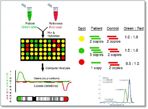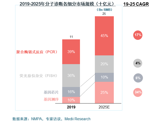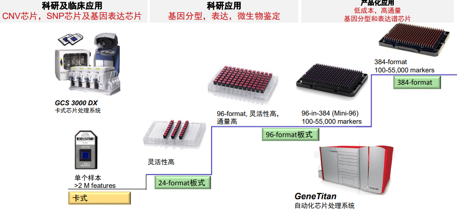 根据Medii Research预测:到2025年,中国分子诊断市场规模约为245亿,其中基因芯片市场会进一步萎缩,市场占比从16%下降到10%,市场份额则进一步萎缩约为25亿元。主要是受限于基因芯片的应用场景、dPCR技术与基因测序等新技术的挤压。 2019年-2025年分子诊断各细分市场规模分析 各种分子诊断技术概览 在生物芯片技术中, 基因芯片技术建立最早, 也最为成熟。基因芯片, 又称DNA微阵列(DNA microarray), 是把大量已知序列探针集成在同一个基片上, 经过标记的若干靶核苷酸序列与芯片特定位点上的探针杂交, 再通过检测杂交信号,对生物细胞或组织中的基因信息进行分析。1991年Stephen Fodor博士首次 提出基因芯片的概念,决定将硅技术与生物学技术融合在一起, 借助半导体技术进行芯片研制, 解读生命有机体在长期进化中累计下来的浩瀚基因信息。美国Affymetrix 生物公司于1996年制造出世界上第一块 商业化的基因芯片。 基因芯片微阵列技术 基因芯片的医学应用有其独特的优势:快速、 高通量。例如在临床诊断方面:仅用极小量的样品,在极短时间内,向医生提供大量的疾病诊断信息。在新药研发方面:可以从疾病及药物两个角度对生物体的多个参量同时进行上万个样品的检测,高效发现和选择合适的药物靶点。但是,基因芯片因为技术特殊性,依然有很多限制因素,技术门槛高、成本高、临床应用场景有限。该技术的把控者主要还是进口品牌,例如赛默飞、因美纳以及安捷伦等。同样因为成本高,以产前诊断为例,每次产前诊断检测费用在2000-3000元。 基因芯片在临床应用场景分析 药物筛选和新药开发:用作大规模的筛选研究可以省略大量的动物试验甚至临床,缩短药物筛选所用时间,提高效率,降低风险。 疾病诊断及治疗:通过基因芯片提供的诊断病理信息,医生能够更好地有的放矢,患者提供个性化诊疗方案。 病原体快速诊断:通过对病毒基因组的全部序列快速监测,可以有效地对病毒携带者进行快速准确的筛查。 产前诊断,可在婚前、孕前、孕早期以及孕中通过父母双方或者孕妇羊水进行基因检测,优生优育。 因为基因芯片的特殊性,所以目前在临床上取得NMPA证书并不多,特别是高通量基因芯片,仅有芯片分析系统是有获得NMPA证书的。现在,世界上主流的芯片制造商有3家,分别是Affymetrix,Agilent以及Illumina,这三家在芯片生产过程、探针长度以及通量上各有不同。国内基因芯片行业起步晚,但是在前期国家政策扶持下,陆续也有一些企业进入这个行业,玩家有博奥生物、伯豪生物等。 NMPA获批芯片扫描系统 NMPA获批芯片试剂产品 产前诊断是基因芯片在临床最为成熟市场之一。产前诊断是指对胎儿进行先天性缺陷和遗传性疾病的诊断,主要是在胎儿出生前采用各种方法,有针对性地进行诊断手术或检测,监测、检测胎儿的健康状况,发现患病胎儿,并通过宫内治疗等技术手段,降低严重致残致畸缺陷儿的出生,达到优生目的。 产前诊断各种分析技术概览 目前,在临床上使用主要是染色体微阵列芯片技术(CMA),基于设计原理的不同,基因芯片主要有两大平台:一种是比较基因组杂交芯片(aCGH),其基于原理是将待测样本DNA与正常对照样本DNA分别用不同的荧光标记,通过与芯片上固定探针进行竞争性杂交获得定量的拷贝数检测结果;另一种是单核苷酸多态性微阵列芯片(SNP array),其基本原理是将探针连接在微珠上,然后将携带探针的微珠随机粘附在芯片上,待测样本DNA和探针进行杂交及单碱基延伸,通过对荧光信号扫描,分析待测样本拷贝数变异及基因型,该平台在分析患者的基因组时不需要正常对照样本。 基于比较基因组杂交的微阵列芯片(aCGH) 基于单核苷酸多态性的微阵列芯片(SNP-array) 赛默飞 美国Affymetrix公司是目前全球基因芯片行业的领头羊,以其专利的寡聚核苷酸原位光刻合成技术,年产各类寡聚核苷酸基因芯片达到几十万张,占据了表达谱基因芯片科研市场的一半以上,经过了将近十年的研究和开发,已经在国际上赢得了很高的盛誉,同时也成为为数极少的已经盈利的生物芯片公司。Affymetrix公司的基因芯片为寡核苷酸芯片(Oligo芯片),这种类型的芯片具有极高的特异性和灵敏度,重复性好,假阳性率非常低,是目前世界上最先进的基因芯片。 赛默飞基因芯片解决方案概览 GeneChip System (GCS) 3000Dx v.2 是临床研究最可靠的平台,也是唯一一款经过美国FDA和中国CFDA批准、带有欧盟IVD和CE标志的芯片系统,适合基于RNA和DNA的临床检测。GeneTitan全自动基因芯片分析系统将从杂交到扫描的实验全过程中用到的杂交炉、流体工作站和CCD扫描成像设备整合为一台仪器,实现了无需手动的基因芯片处理,最大限度地提高了数据重复性和实验室的工作效率,该系统支持16-、24-、96-和384-孔芯片板的基因表达和基因分型研究,尤其适合于对大量样品进行高通量检测的情形。 因美纳 illumina收购了Solexa公司之后,从此拥有了SBS(Sequence-by-Synthesis,边合成边测序)技术,并凭借该技术成为测序行业的王者,拥有业内测序系统最宽的产品线和最大的客户群体。illumina 方案的测序芯片称为「Infinium」(曾用名「Bead Array」),顾名思义由玻璃基片和微珠组成。因美纳芯片技术(也被称为微珠芯片技术)使用了二氧化硅微珠。在每个芯片(或BeadChip)的表面,一次可以同时分析单个个体的数十万到数百万种基因型。这些微小的二氧化