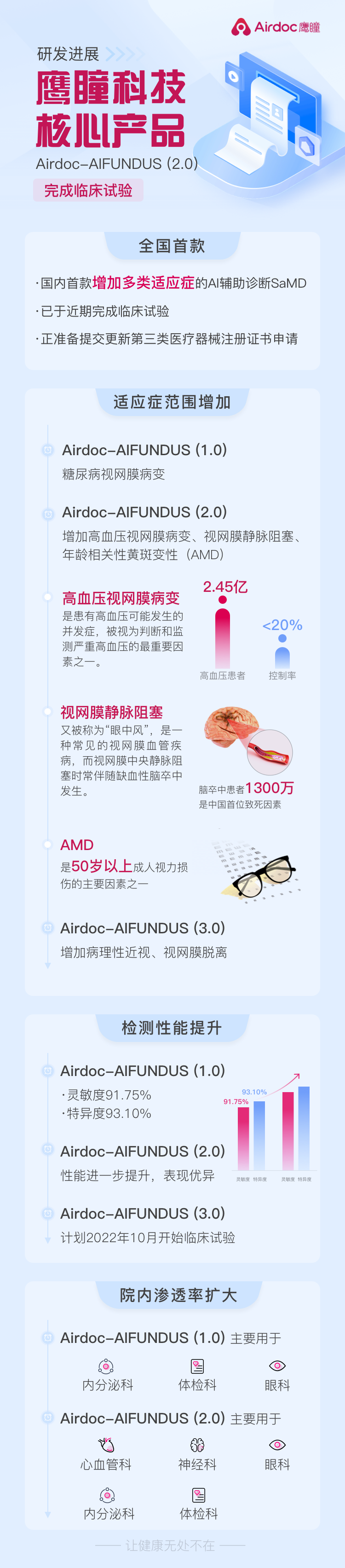 随着Airdoc-AIFUNDUS (2.0)增加覆盖了高血压视网膜病变、视网膜静脉阻塞和AMD,该产品获批后将可以协助医生在心血管科、神经科眼科检测和诊断相关疾病,也将有助于持续检测相关药物的临床效果,有望大幅提高该产品在院内的渗透率及销售机会和市场空间。